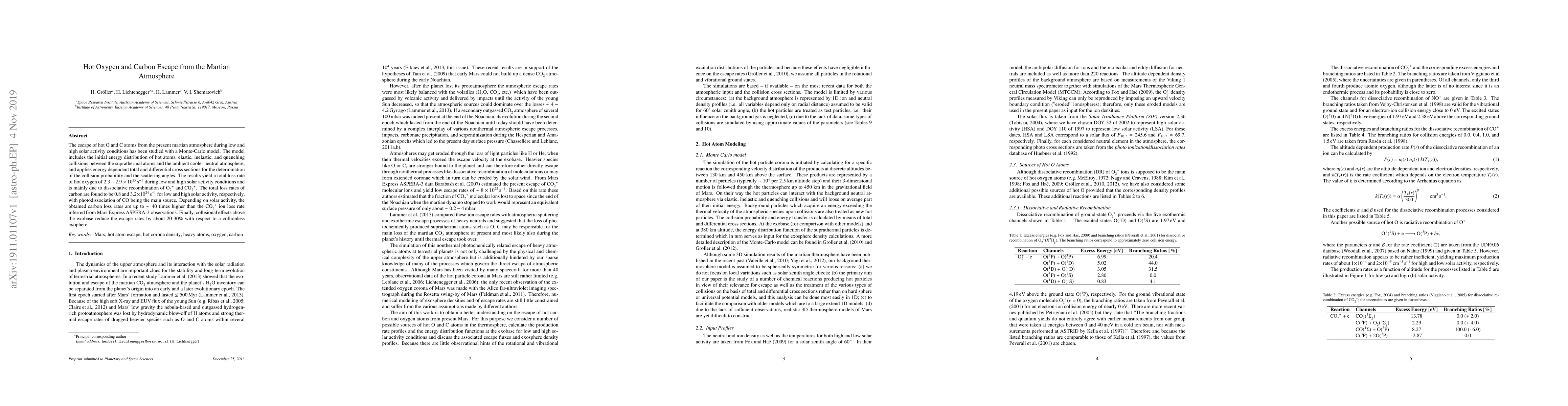 This study uses a Monte-Carlo model to analyze the escape of hot oxygen and carbon atoms from Mars' atmosphere under varying solar activity, finding total loss rates of $2.3-2.9\times 10^{25}\,{\rm s}^{-1}$ for oxygen and $0.8-3.2\times 10^{24}\,{\rm s}^{-1}$ for carbon, with collisional effects reducing escape rates by $20-30\,\%$.