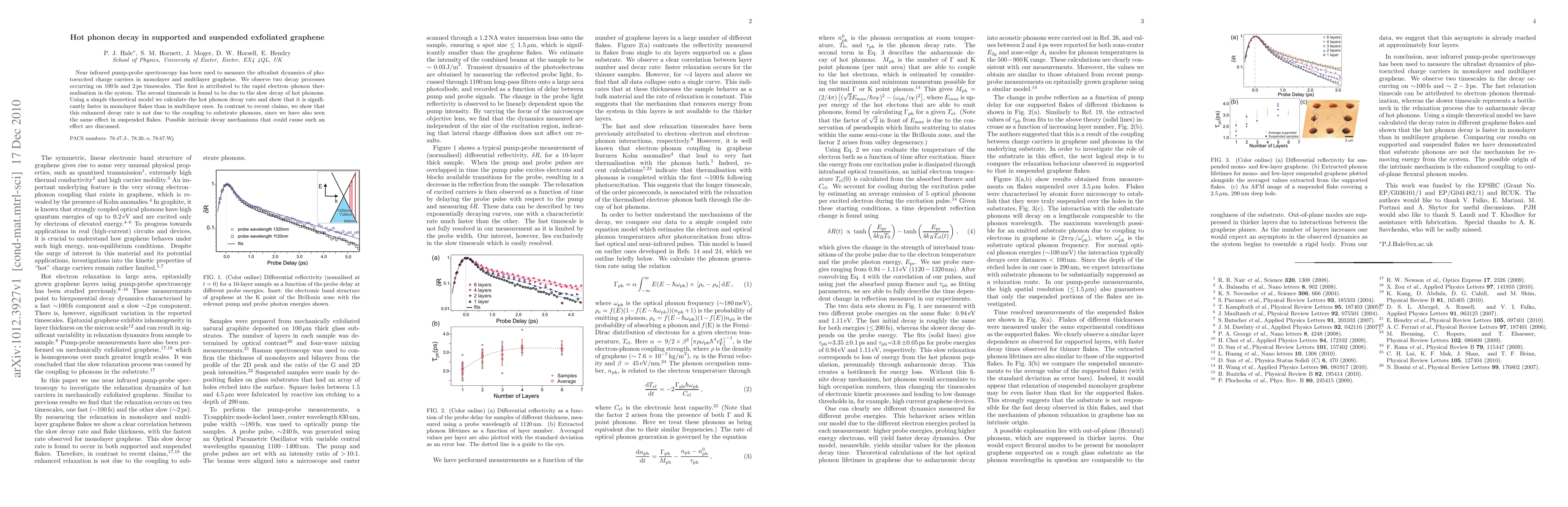 This study uses near infrared pump-probe spectroscopy to investigate the ultrafast decay processes in exfoliated graphene, identifying two decay timescales of 100 fs and 2 ps. The enhanced decay rate of hot phonons in monolayer graphene compared to multilayer is shown to be intrinsic, not due to substrate coupling, as the same effect occurs in suspended flakes.