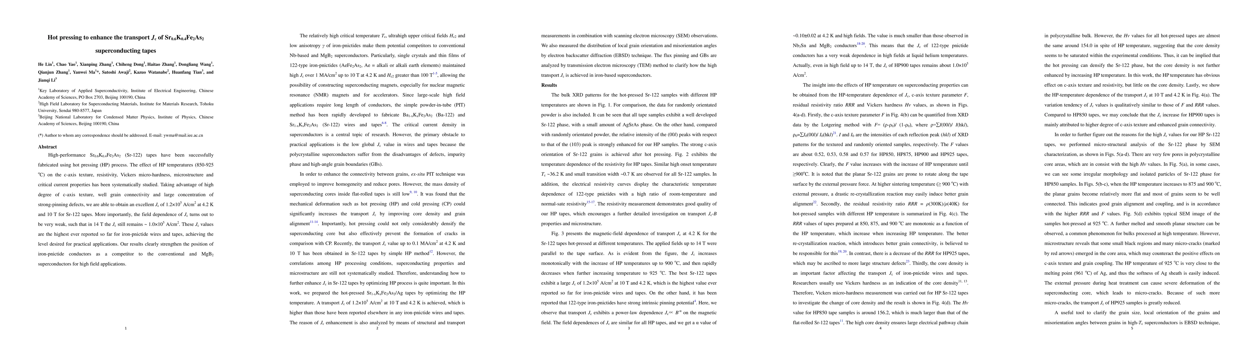 Researchers successfully created high-performance Sr0.6K0.4Fe2As2 superconducting tapes through hot pressing, achieving record-high critical current properties of 1.2x10^5 A/cm^2 at 4.2 K and 10 T.