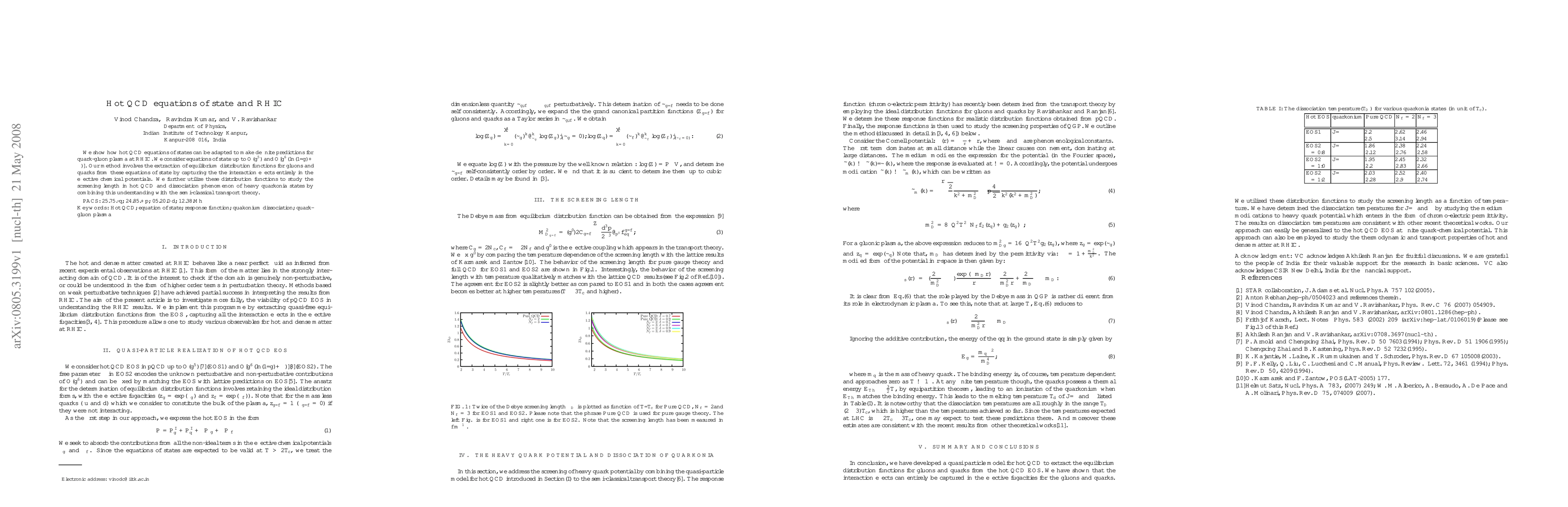 This research paper adapts hot QCD equations of state to predict properties of quark-gluon plasma at RHIC, including screening length and dissociation of heavy quarkonia states.
