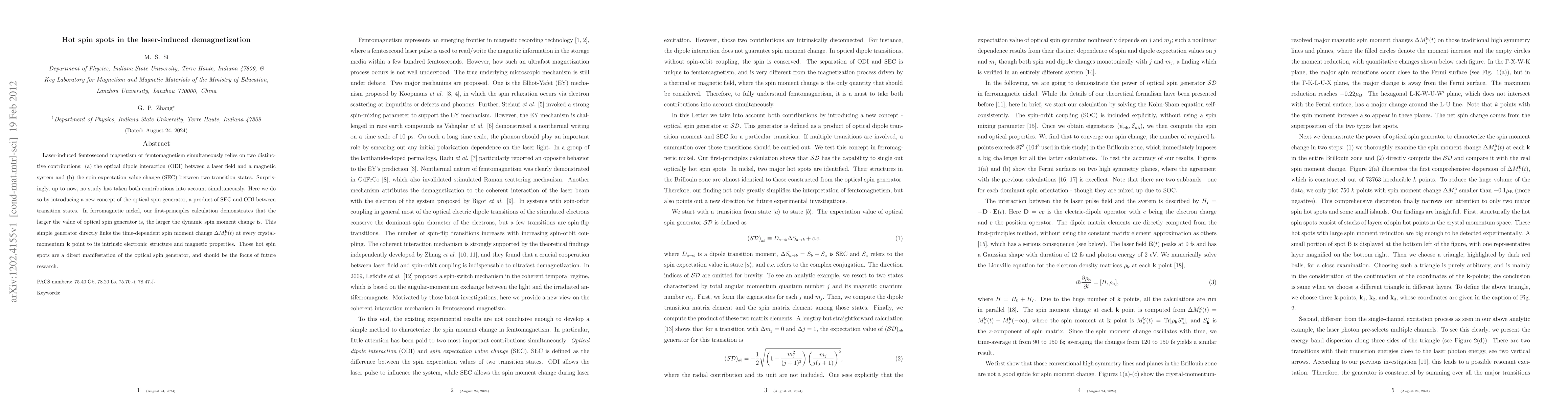 Laser-induced femtosecond magnetism or femtomagnetism simultaneously relies on two distinctive contributions: (a) the optical dipole interaction (ODI) between a laser field and a magnetic system and (b) the spin expectation value change (SEC) between two transition states. Surprisingly, up to now, no study has taken both contributions into account simultaneously. Here we do so by introducing a new concept of the optical spin generator, a product of SEC and ODI between transition states. In ferromagnetic nickel, our first-principles calculation demonstrates that the larger the value of optical spin generator is, the larger the dynamic spin moment change is. This simple generator directly links the time-dependent spin moment change {\Delta}Mk z (t) at every crystal- momentum k point to its intrinsic electronic structure and magnetic properties. Those hot spin spots are a direct manifestation of the optical spin generator, and should be the focus of future research.