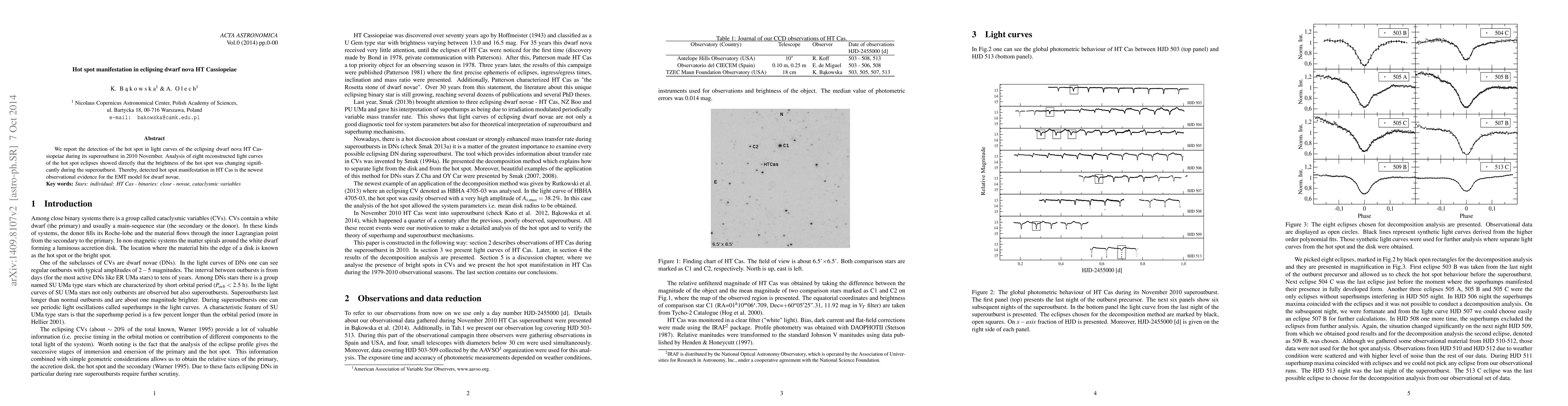 This paper reports the detection of a hot spot in the light curves of the eclipsing dwarf nova HT Cassiopeiae during its 2010 superoutburst, revealing significant brightness changes. This observation supports the EMT model for dwarf novae.