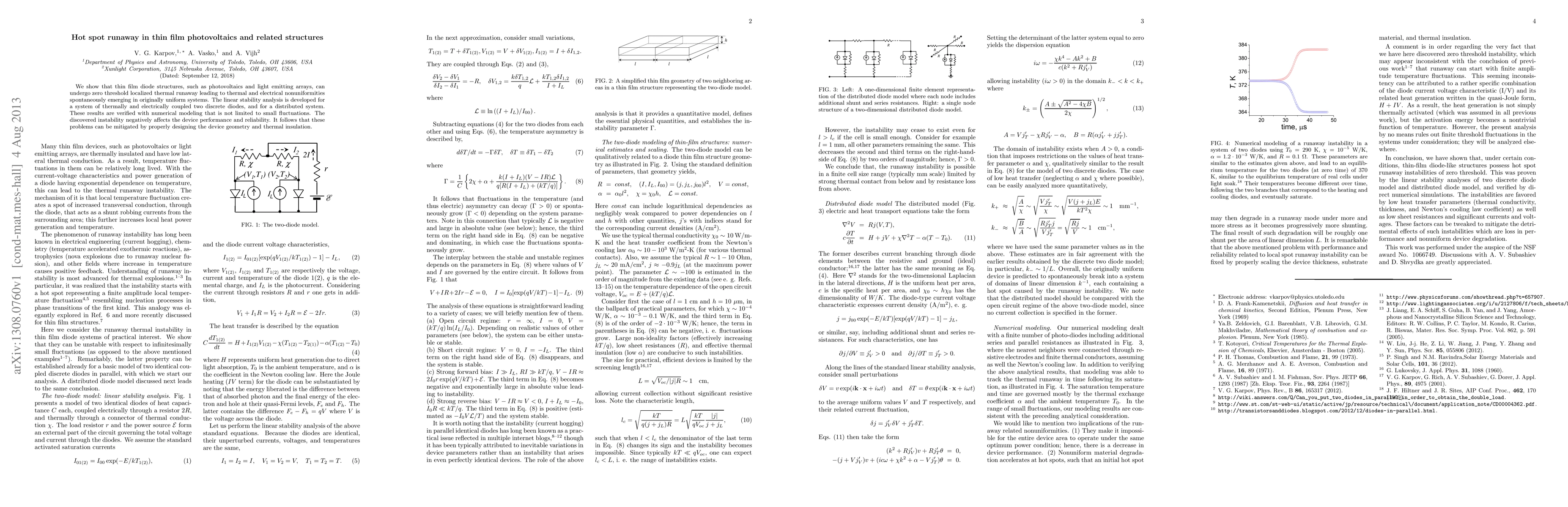 We show that thin film diode structures, such as photovoltaics and light emitting arrays, can undergo zero threshold localized thermal runaway leading to thermal and electrical nonuniformities spontaneously emerging in originally uniform systems. The linear stability analysis is developed for a system of thermally and electrically coupled two discrete diodes, and for a distributed system. These results are verified with numerical modeling that is not limited to small fluctuations. The discovered instability negatively affects the device performance and reliability. It follows that these problems can be mitigated by properly designing the device geometry and thermal insulation.