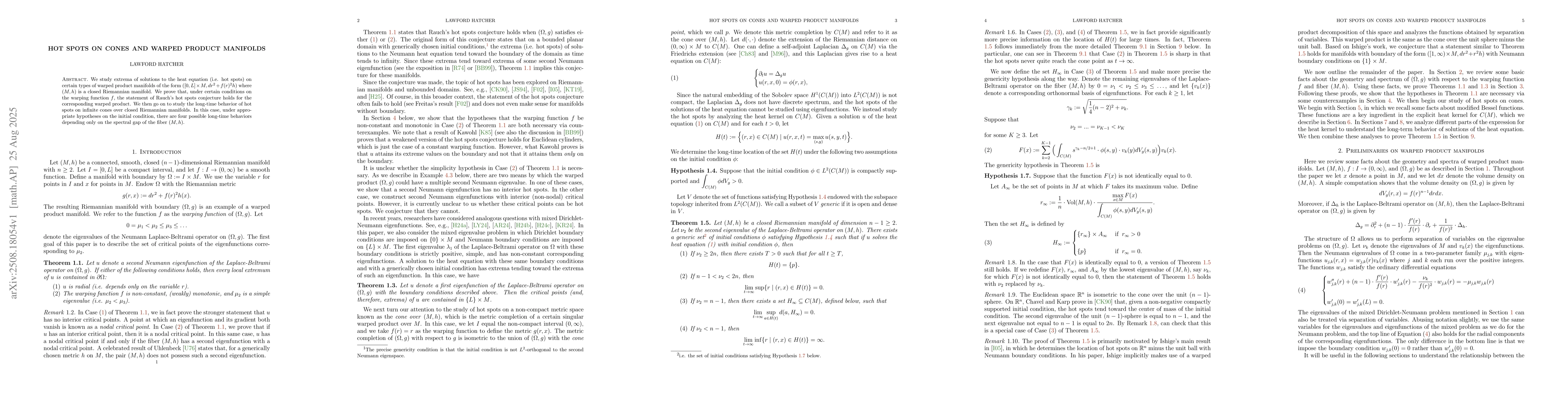 We study extrema of solutions to the heat equation (i.e. hot spots) on certain types of warped product manifolds of the form $([0,L]\times M,dr^2+f(r)^2h)$ where $(M,h)$ is a closed Riemannian manifold. We prove that, under certain conditions on the warping function $f$, the statement of Rauch's hot spots conjecture holds for the corresponding warped product. We then go on to study the long-time behavior of hot spots on infinite cones over closed Riemannian manifolds. In this case, under appropriate hypotheses on the initial condition, there are four possible long-time behaviors depending only on the spectral gap of the fiber $(M,h)$.