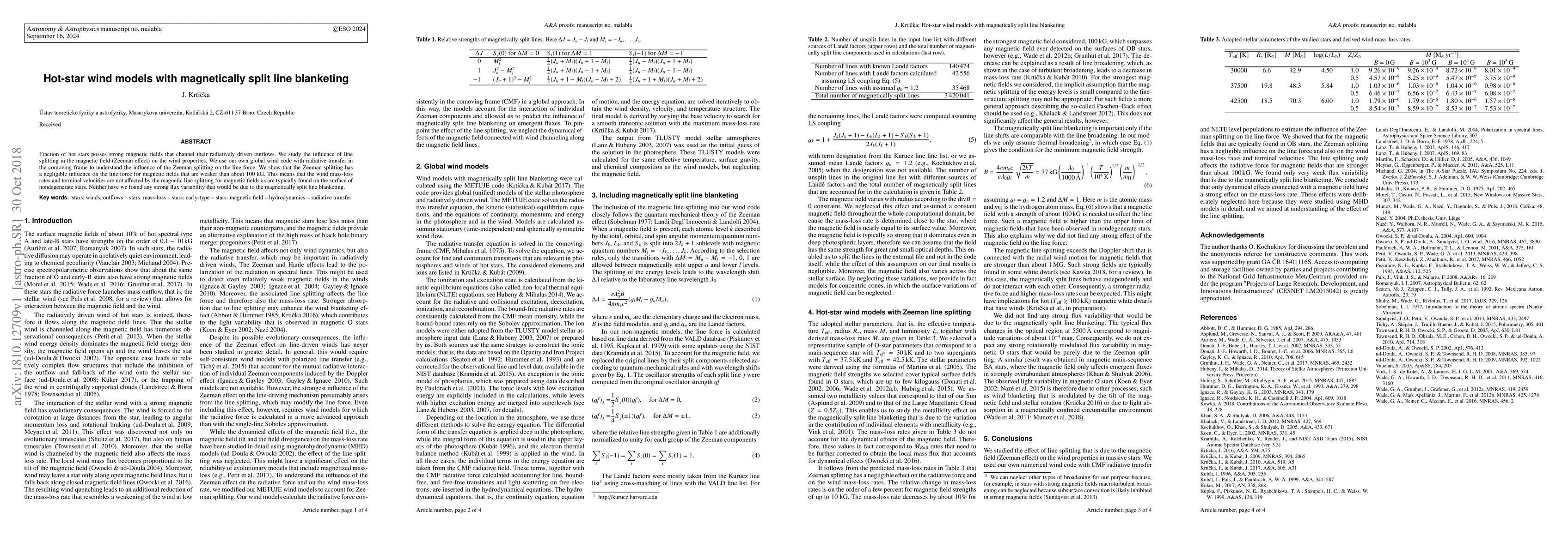 Fraction of hot stars posses strong magnetic fields that channel their radiatively driven outflows. We study the influence of line splitting in the magnetic field (Zeeman effect) on the wind properties. We use our own global wind code with radiative transfer in the comoving frame to understand the influence of the Zeeman splitting on the line force. We show that the Zeeman splitting has a negligible influence on the line force for magnetic fields that are weaker than about 100~kG. This means that the wind mass-loss rates and terminal velocities are not affected by the magnetic line splitting for magnetic fields as are typically found on the surface of nondegenerate stars. Neither have we found any strong flux variability that would be due to the magnetically split line blanketing.