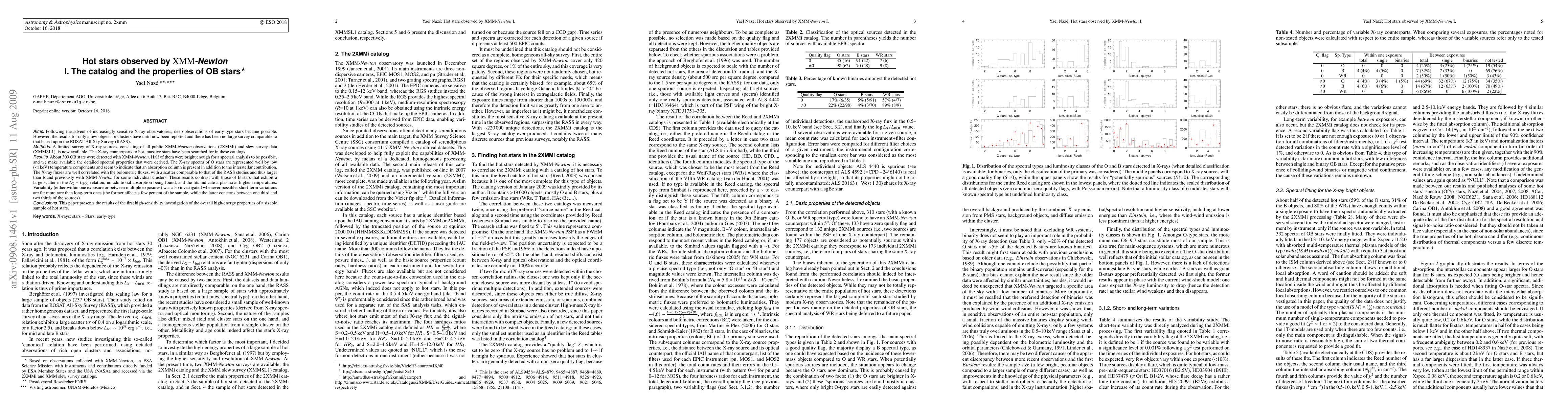 Aims : Following the advent of increasingly sensitive X-ray observatories, deep observations of early-type stars became possible. However, the results for only a few objects or clusters have until now been reported and there has been no large survey comparable to that based upon the ROSAT All-Sky Survey (RASS). Methods : A limited survey of X-ray sources, consisting of all public XMM observations (2XMMi) and slew survey data (XMMSL1), is now available. The X-ray counterparts to hot, massive stars have been searched for in these catalogs. Results : About 300 OB stars were detected with XMM. Half of them were bright enough for a spectral analysis to be possible, and we make available the detailed spectral properties that were derived. The X-ray spectra of O stars are represented well by low (<1keV) temperature components and seem to indicate that an absorption column is present in addition to the interstellar contribution. The X-ray fluxes are well correlated with the bolometric fluxes, with a scatter comparable to that of the RASS studies and thus larger than found previously with XMM for some individual clusters. These results contrast with those of B stars that exhibit a large scatter in the L_X-L_BOL relation, no additional absorption being found, and the fits indicate a plasma at higher temperatures. Variability (either within one exposure or between multiple exposures) was also investigated whenever possible: short-term variations are far more rare than long-term ones (the former affects a few percent of the sample, while the latter concerns between one third and two thirds of the sources). Conclusions : This paper presents the results of the first high-sensitivity investigation of the overall high-energy properties of a sizable sample of hot stars.