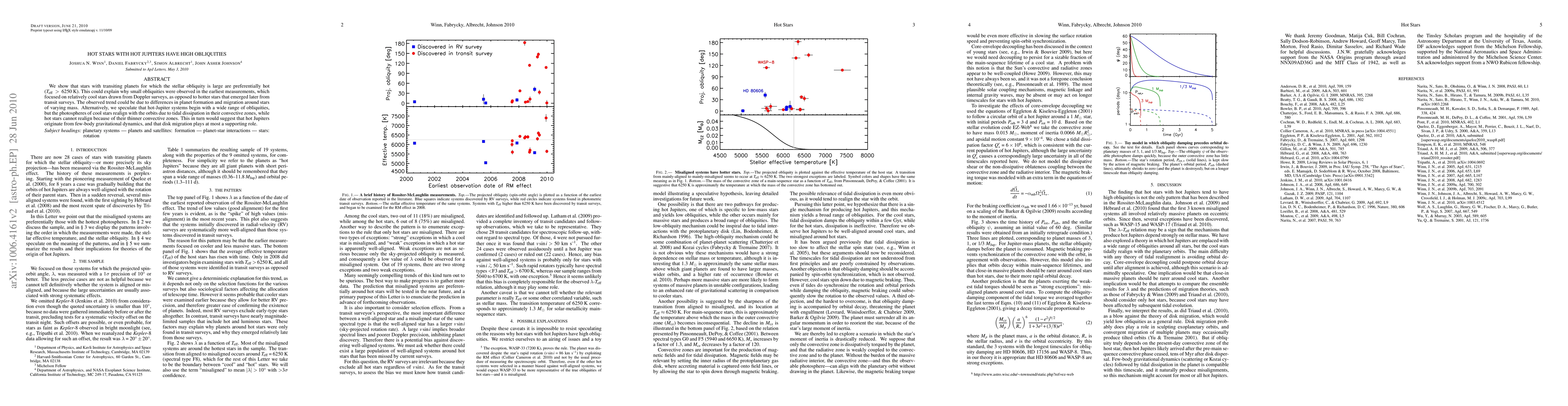 This study finds that hot stars (T_eff > 6250 K) with transiting hot Jupiters exhibit high stellar obliquities, suggesting different planet formation and migration processes for stars of varying mass. The trend may indicate that hot Jupiters originate from gravitational dynamics rather than disk migration.