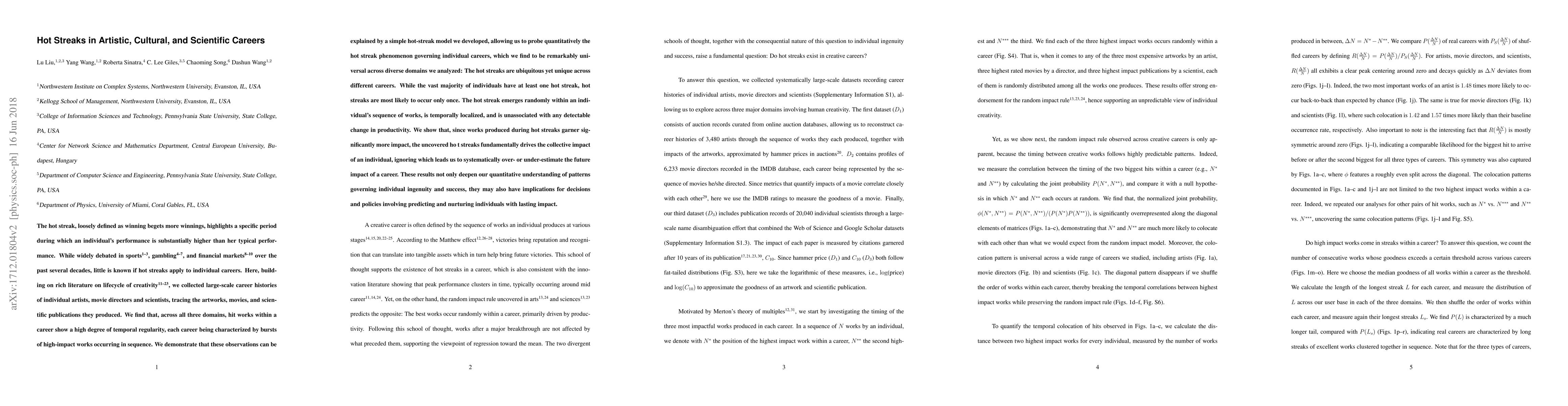 The study reveals that hot streaks—periods where individuals produce significantly higher-impact works—are common across artistic, cultural, and scientific careers, with these bursts of high performance being unique yet universal across different domains. The findings underscore the importance of considering hot streaks when predicting and evaluating individual impact and success.