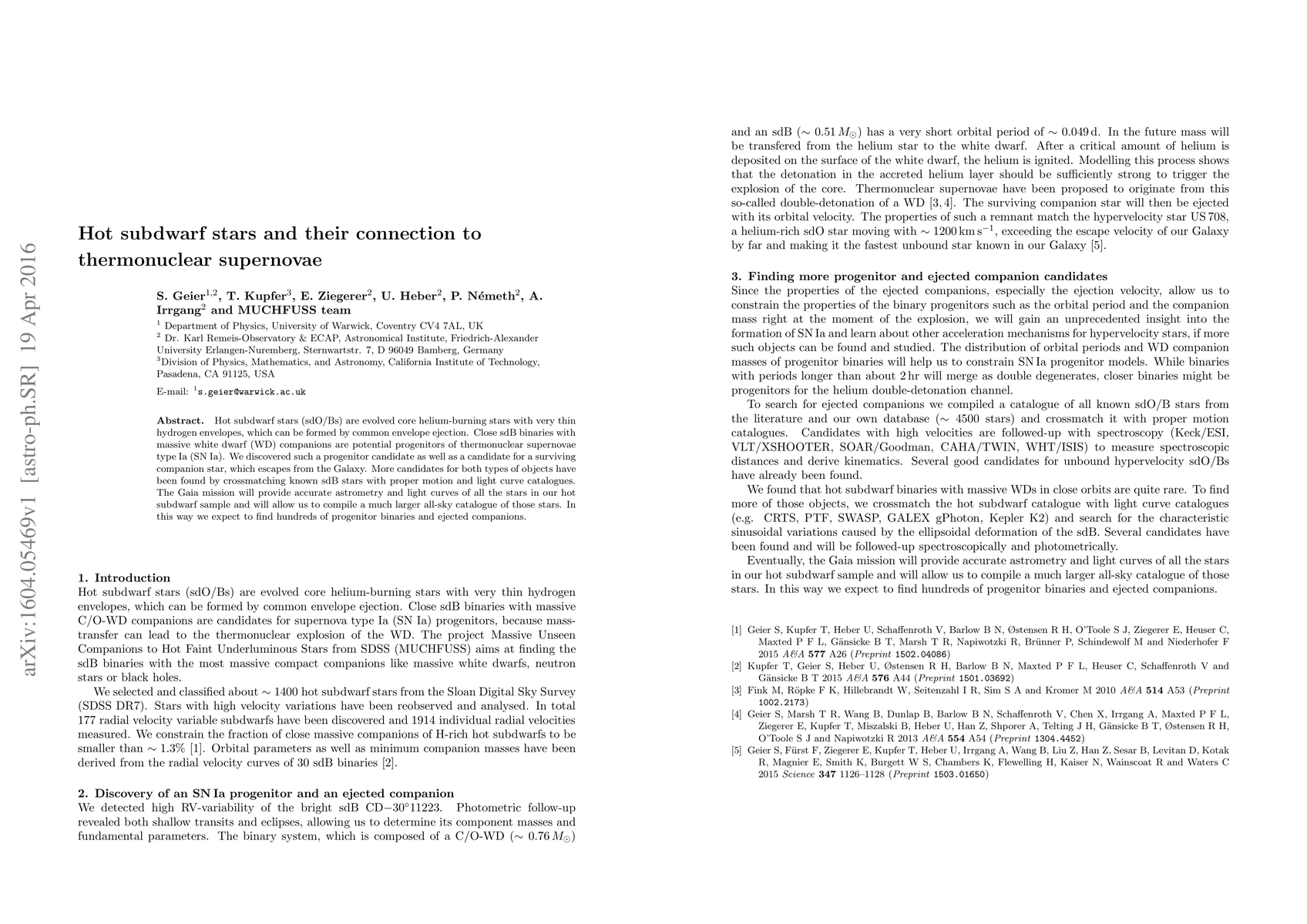 This paper identifies hot subdwarf stars (sdO/Bs) as potential progenitors for thermonuclear supernovae type Ia (SN Ia) through their formation in close sdB binaries with massive white dwarf companions. The authors discovered a progenitor candidate and a surviving companion star, and anticipate finding hundreds more with the help of the Gaia mission's detailed astrometry and light curves.