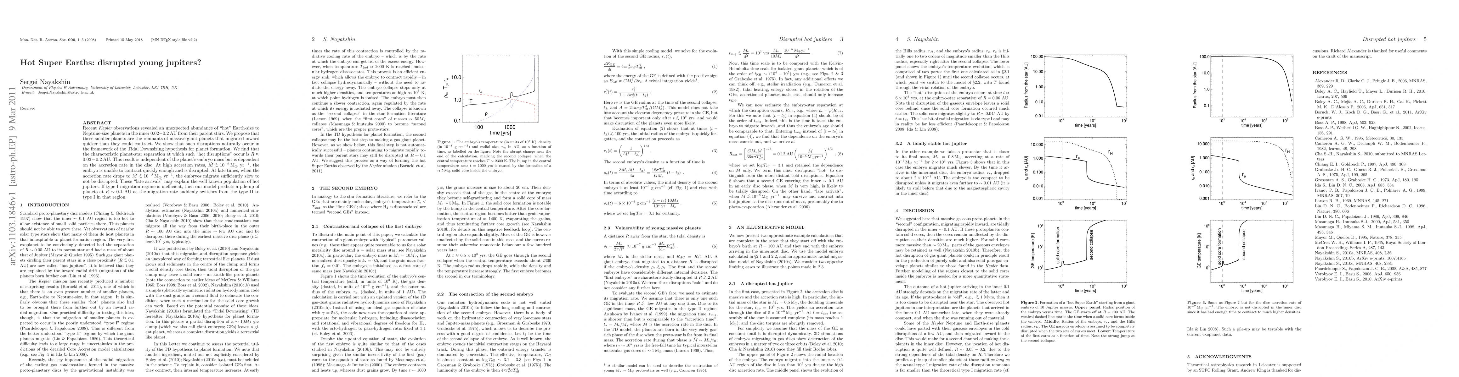 Recent {\em Kepler} observations revealed an unexpected abundance of "hot" Earth-size to Neptune-size planets in the inner $0.02-0.2$ AU from their parent stars. We propose that these smaller planets are the remnants of massive giant planets that migrated inward quicker than they could contract. We show that such disruptions naturally occur in the framework of the Tidal Downsizing hypothesis for planet formation. We find that the characteristic planet-star separation at which such "hot disruptions" occur is $R \approx 0.03-0.2$ AU. This result is independent of the planet's embryo mass but is dependent on the accretion rate in the disc. At high accretion rates, $\dot M \simgt 10^{-6}\msun$ yr$^{-1}$, the embryo is unable to contract quickly enough and is disrupted. At late times, when the accretion rate drops to $\dot M \simlt 10^{-8} \msun$ yr$^{-1}$, the embryos migrate sufficiently slow to not be disrupted. These "late arrivals" may explain the well known population of hot jupiters. If type I migration regime is inefficient, then our model predicts a pile-up of planets at $R\sim 0.1$ AU as the migration rate suddenly switches from the type II to type I in that region.