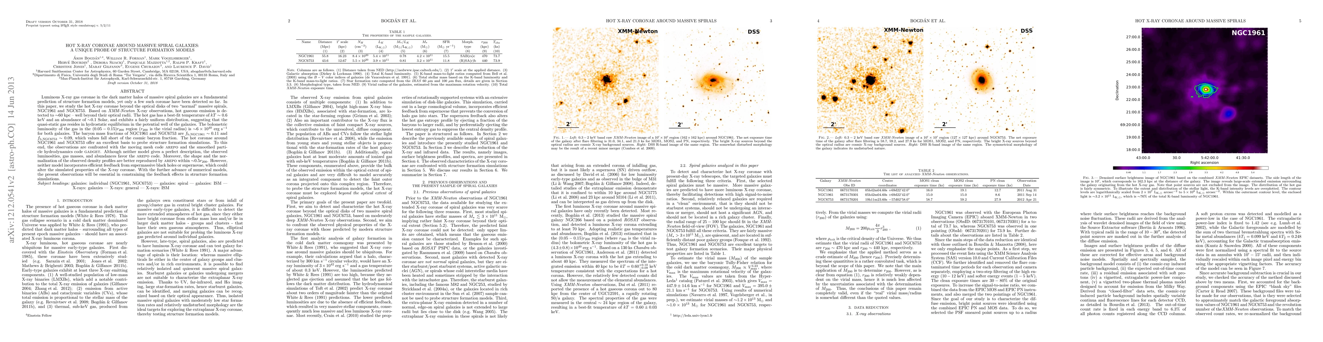 This paper detects hot X-ray coronae in the dark matter halos of two massive spiral galaxies, NGC1961 and NGC6753, using XMM-Newton observations. The findings suggest these coronae can help refine structure formation models, with the Arepo code showing better agreement with observed properties.