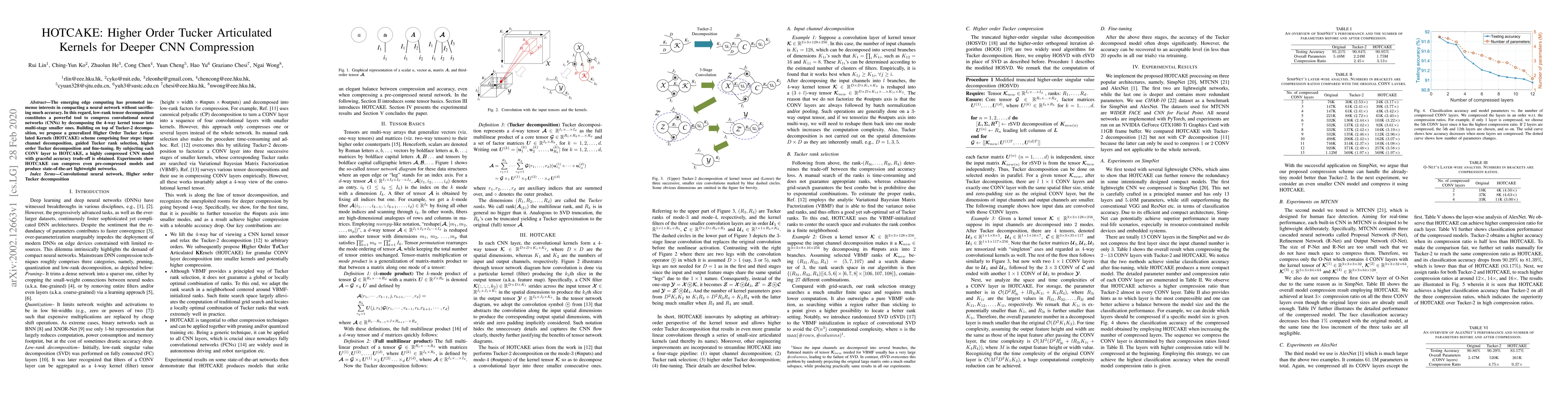 This paper proposes HOTCAKE, a scheme to compress convolutional neural networks (CNNs) by decomposing their 4-way kernel tensor into smaller ones, achieving state-of-the-art lightweight networks with a trade-off in accuracy.