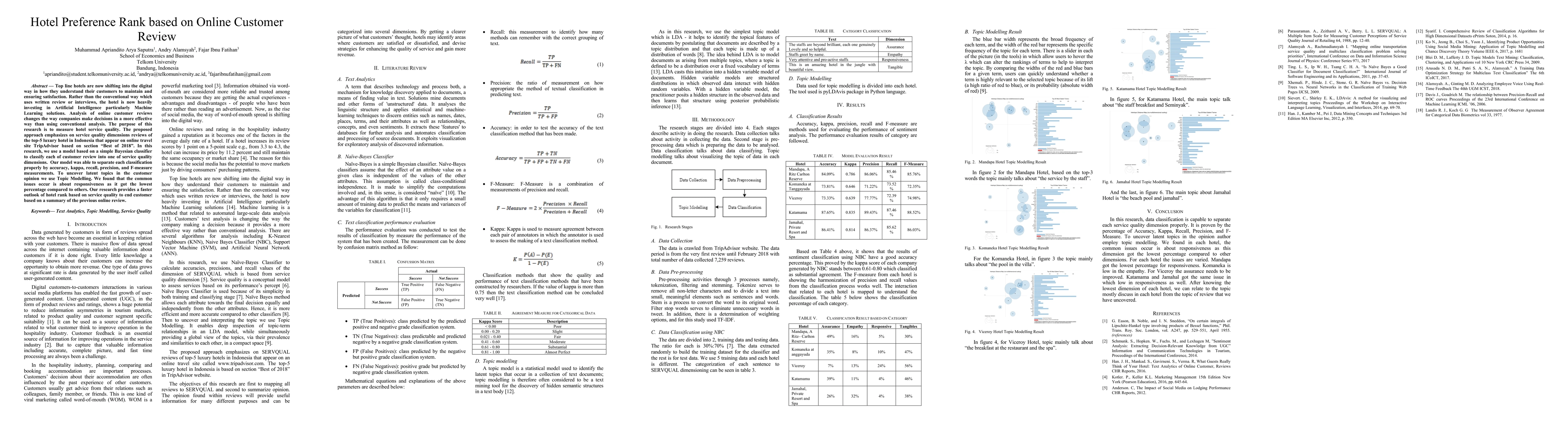Topline hotels are now shifting into the digital way in how they understand their customers to maintain and ensuring satisfaction. Rather than the conventional way which uses written reviews or interviews, the hotel is now heavily investing in Artificial Intelligence particularly Machine Learning solutions. Analysis of online customer reviews changes the way companies make decisions in a more effective way than using conventional analysis. The purpose of this research is to measure hotel service quality. The proposed approach emphasizes service quality dimensions reviews of the top-5 luxury hotel in Indonesia that appear on the online travel site TripAdvisor based on section Best of 2018. In this research, we use a model based on a simple Bayesian classifier to classify each customer review into one of the service quality dimensions. Our model was able to separate each classification properly by accuracy, kappa, recall, precision, and F-measure measurements. To uncover latent topics in the customer's opinion we use Topic Modeling. We found that the common issue that occurs is about responsiveness as it got the lowest percentage compared to others. Our research provides a faster outlook of hotel rank based on service quality to end customers based on a summary of the previous online review.