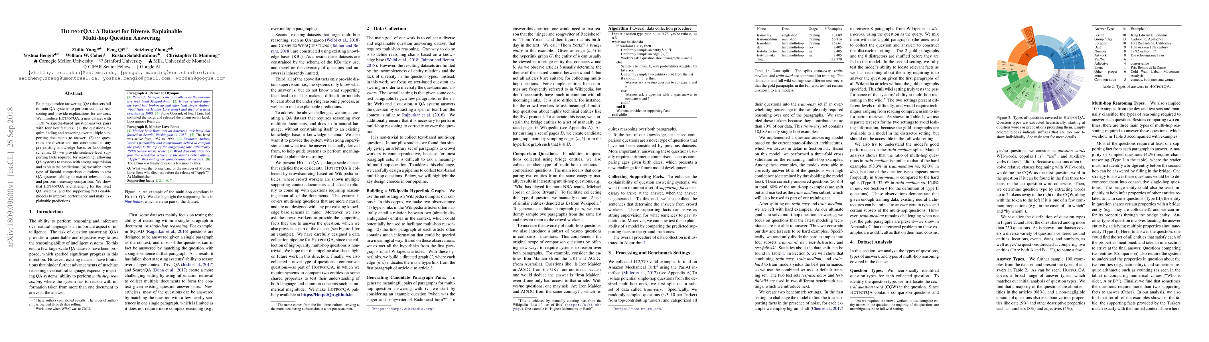 Existing question answering (QA) datasets fail to train QA systems to perform complex reasoning and provide explanations for answers. We introduce HotpotQA, a new dataset with 113k Wikipedia-based question-answer pairs with four key features: (1) the questions require finding and reasoning over multiple supporting documents to answer; (2) the questions are diverse and not constrained to any pre-existing knowledge bases or knowledge schemas; (3) we provide sentence-level supporting facts required for reasoning, allowing QA systems to reason with strong supervision and explain the predictions; (4) we offer a new type of factoid comparison questions to test QA systems' ability to extract relevant facts and perform necessary comparison. We show that HotpotQA is challenging for the latest QA systems, and the supporting facts enable models to improve performance and make explainable predictions.