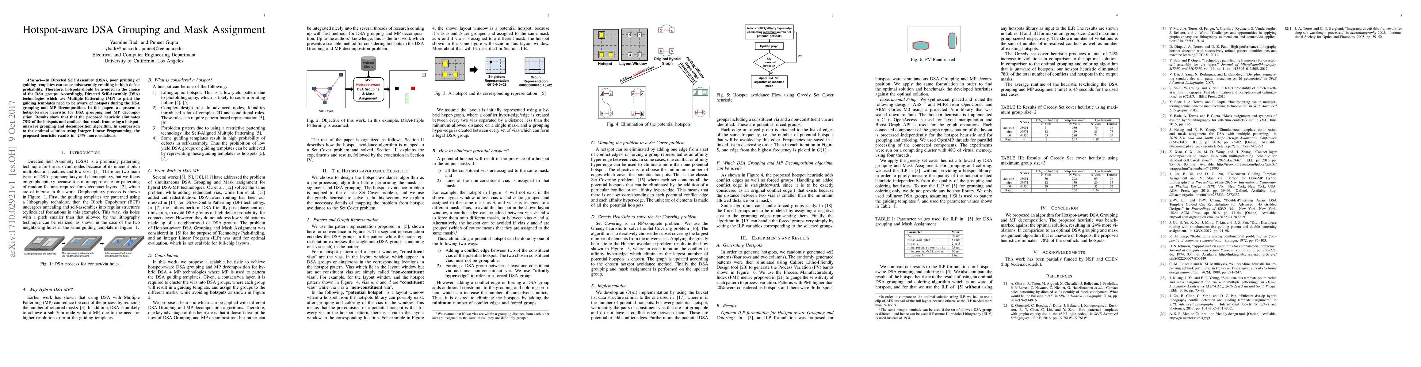 A new heuristic for Directed Self Assembly (DSA) grouping reduces hotspot conflicts by 78%, but introduces ~24% more violations than an optimal solution found using Integer Linear Programming.