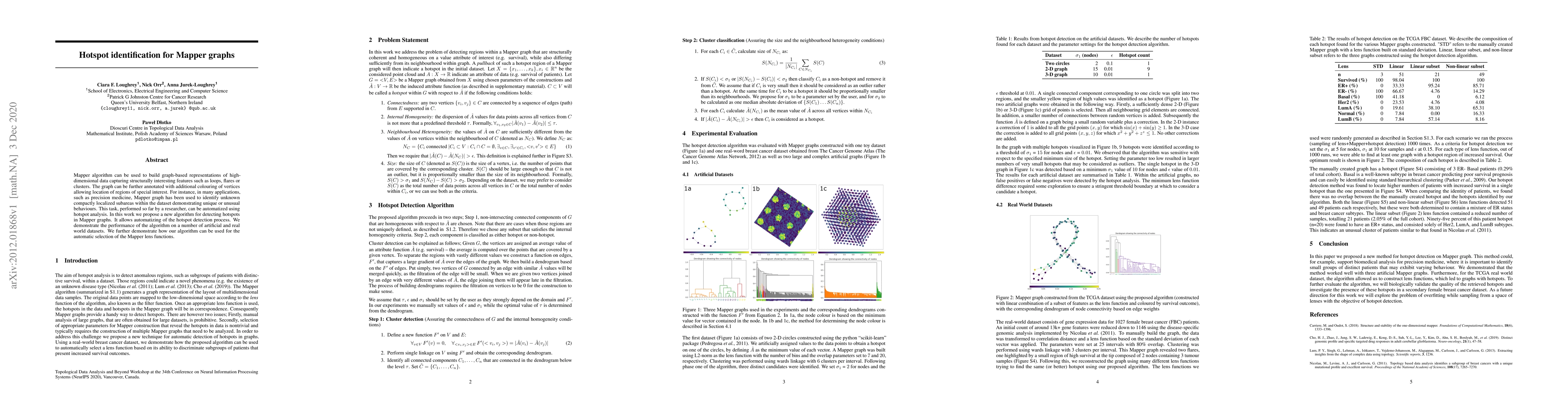 Mapper algorithm can be used to build graph-based representations of high-dimensional data capturing structurally interesting features such as loops, flares or clusters. The graph can be further annotated with additional colouring of vertices allowing location of regions of special interest. For instance, in many applications, such as precision medicine, Mapper graph has been used to identify unknown compactly localized subareas within the dataset demonstrating unique or unusual behaviours. This task, performed so far by a researcher, can be automatized using hotspot analysis. In this work we propose a new algorithm for detecting hotspots in Mapper graphs. It allows automatizing of the hotspot detection process. We demonstrate the performance of the algorithm on a number of artificial and real world datasets. We further demonstrate how our algorithm can be used for the automatic selection of the Mapper lens functions.