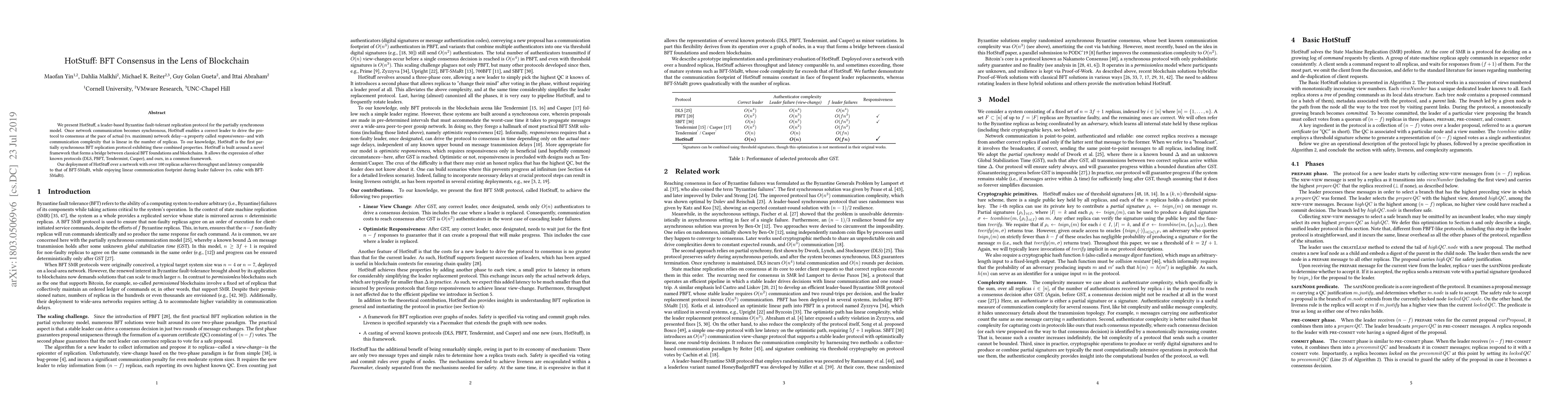 We present HotStuff, a leader-based Byzantine fault-tolerant replication protocol for the partially synchronous model. Once network communication becomes synchronous, HotStuff enables a correct leader to drive the protocol to consensus at the pace of actual (vs. maximum) network delay--a property called responsiveness--and with communication complexity that is linear in the number of replicas. To our knowledge, HotStuff is the first partially synchronous BFT replication protocol exhibiting these combined properties. HotStuff is built around a novel framework that forms a bridge between classical BFT foundations and blockchains. It allows the expression of other known protocols (DLS, PBFT, Tendermint, Casper), and ours, in a common framework. Our deployment of HotStuff over a network with over 100 replicas achieves throughput and latency comparable to that of BFT-SMaRt, while enjoying linear communication footprint during leader failover (vs. quadratic with BFT-SMaRt).