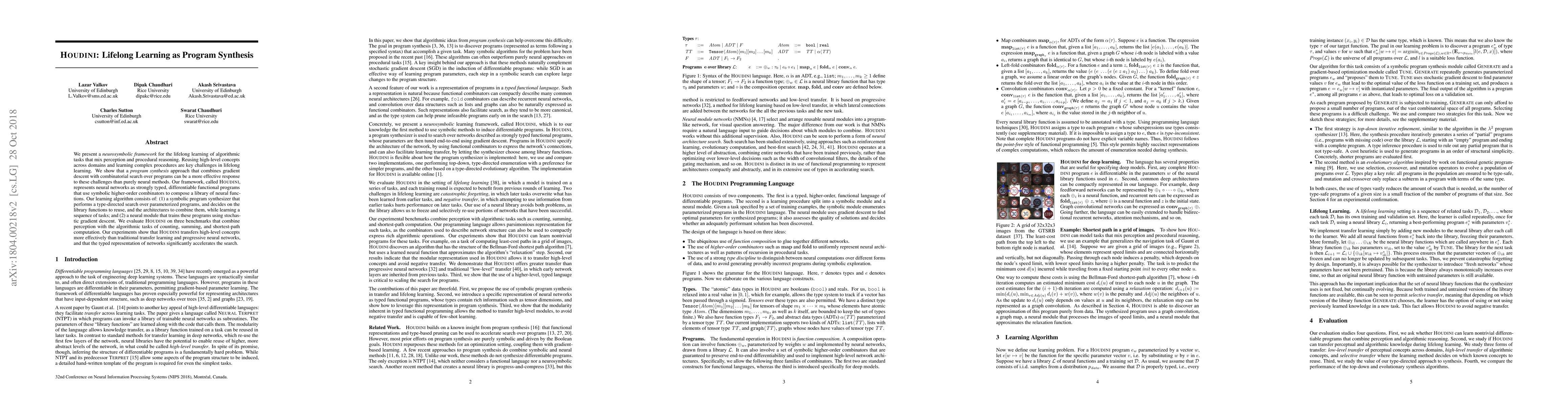 HOUDINI is a neurosymbolic framework for lifelong learning that combines program synthesis with gradient descent to tackle challenges in reusing high-level concepts across domains. It outperforms traditional methods by effectively transferring high-level concepts and accelerating the search through a typed representation of neural networks.