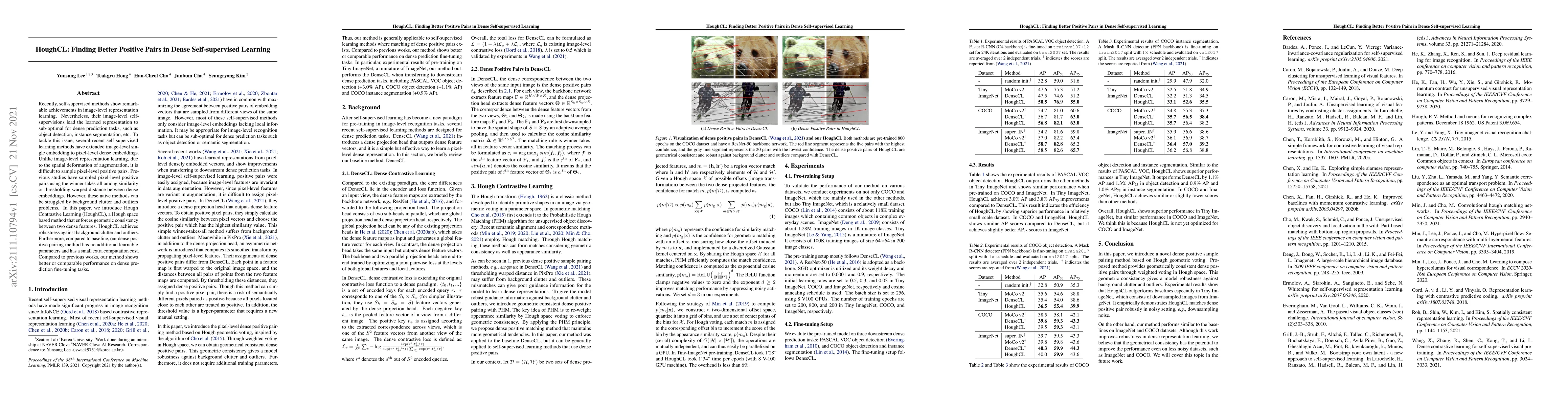 HoughCL introduces a Hough space-based method to find better positive pairs in dense self-supervised learning, addressing background clutter and outliers issues. It achieves robust geometric consistency without additional learnable parameters and demonstrates better or comparable performance on dense prediction tasks.
