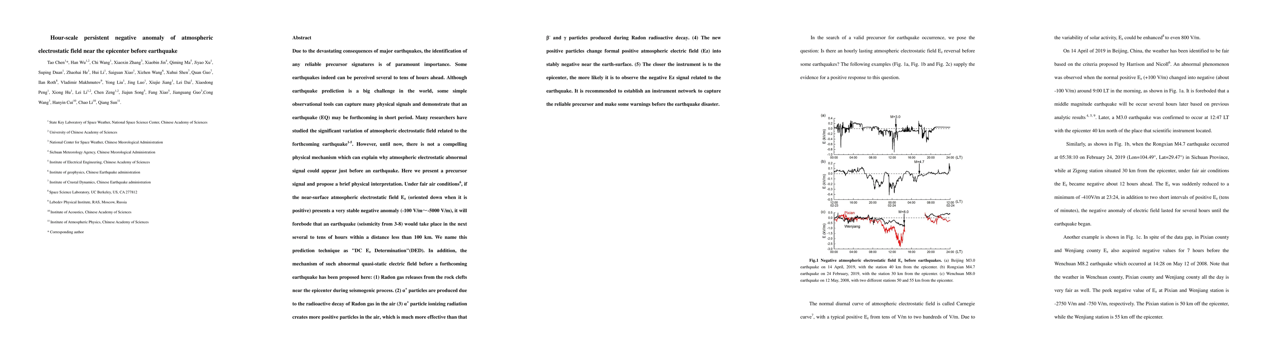 This paper presents a "DC Ez Determination" technique to predict earthquakes based on persistent negative anomalies in the near-surface atmospheric electrostatic field (Ez) observed in the hours before an earthquake. The proposed mechanism involves radon gas release and the ionizing effect of alpha particles from its decay, which alters the atmospheric electric field.
