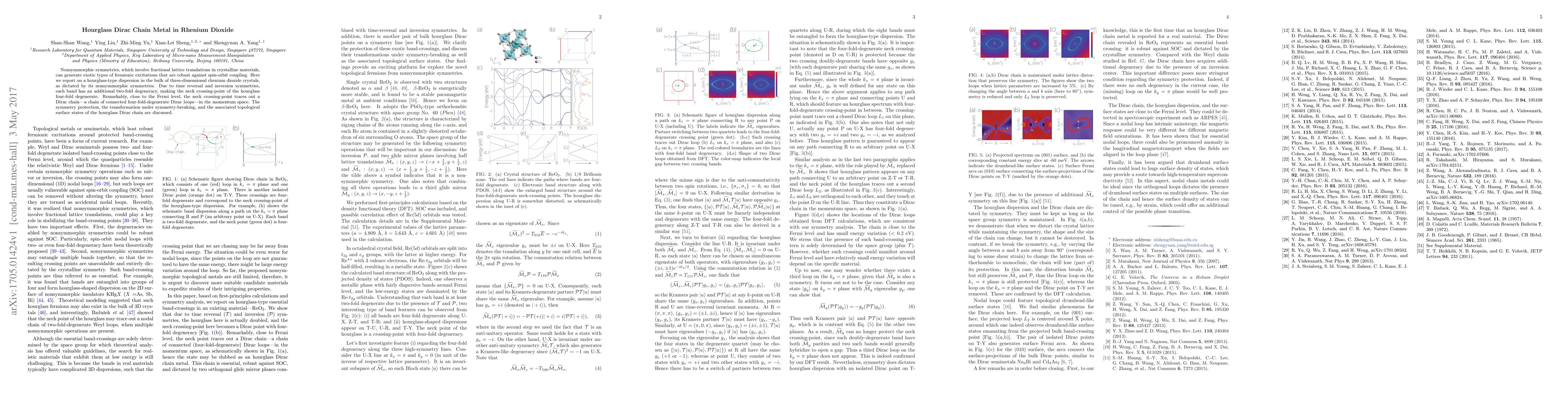 This paper reports on the discovery of an hourglass Dirac chain metal in rhenium dioxide, characterized by nonsymmorphic symmetries leading to exotic fermionic excitations. The material exhibits a four-fold degenerate Dirac chain near the Fermi level, protected by time reversal and inversion symmetries, with implications for topological surface states.