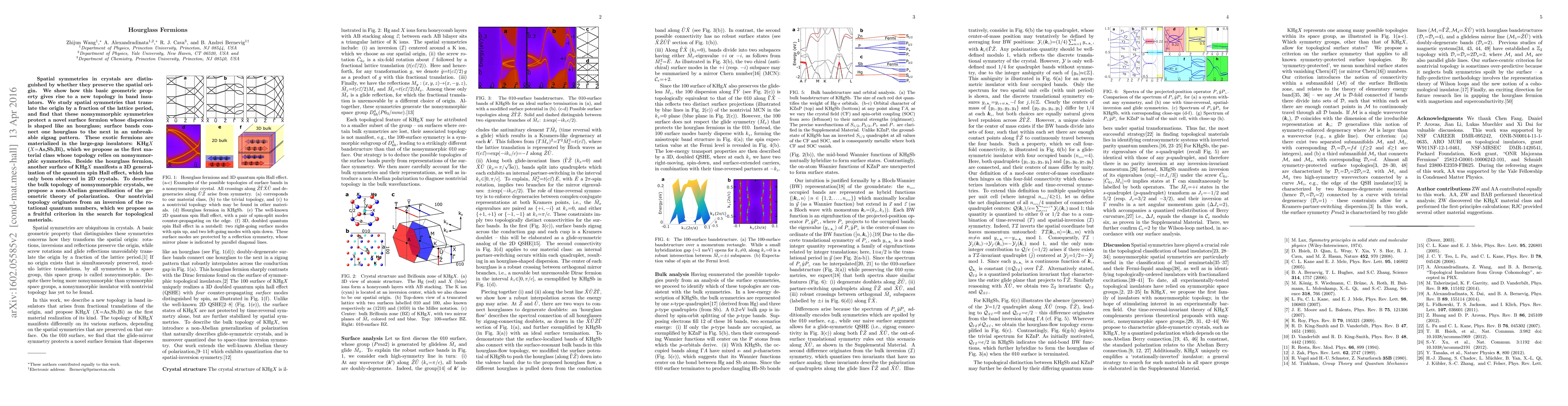 This paper introduces "hourglass fermions" in nonsymmorphic crystal symmetries, revealing a new topological state in band insulators KHgX (X=As,Sb,Bi). These fermions exhibit an hourglass-shaped dispersion and are protected by spatial symmetries that shift the lattice origin fractionally, also manifesting a 3D quantum spin Hall effect.