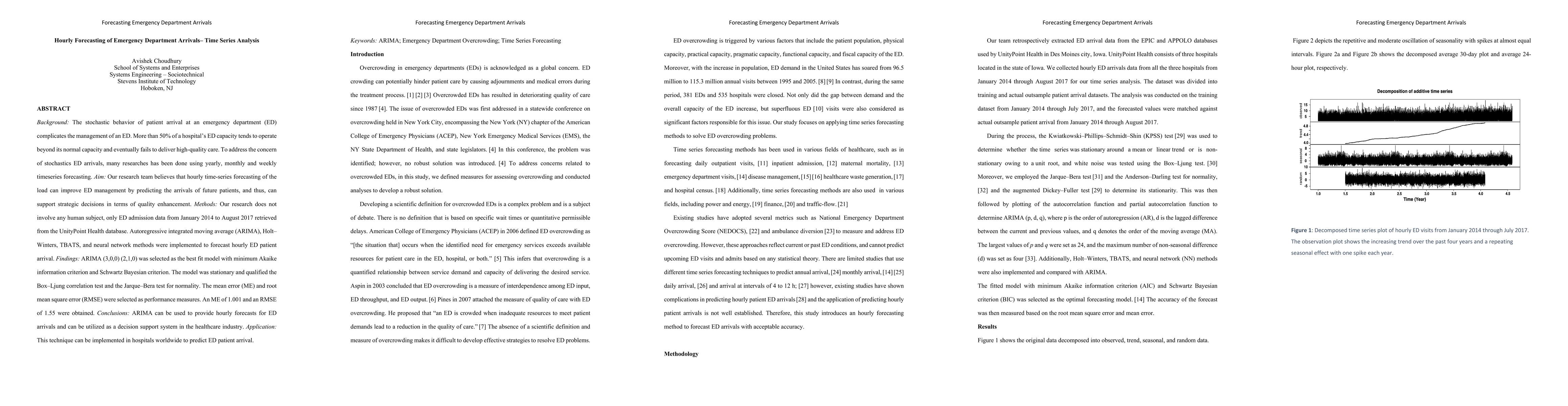 This study explores hourly forecasting models for emergency department (ED) patient arrivals using ARIMA, Holt Winters, TBATS, and neural networks. The ARIMA (3,0,0) (2,1,0) model was identified as the best fit, demonstrating high accuracy with a mean error of 1.001 and RMSE of 1.55, suggesting its potential for improving ED management and strategic decision-making.