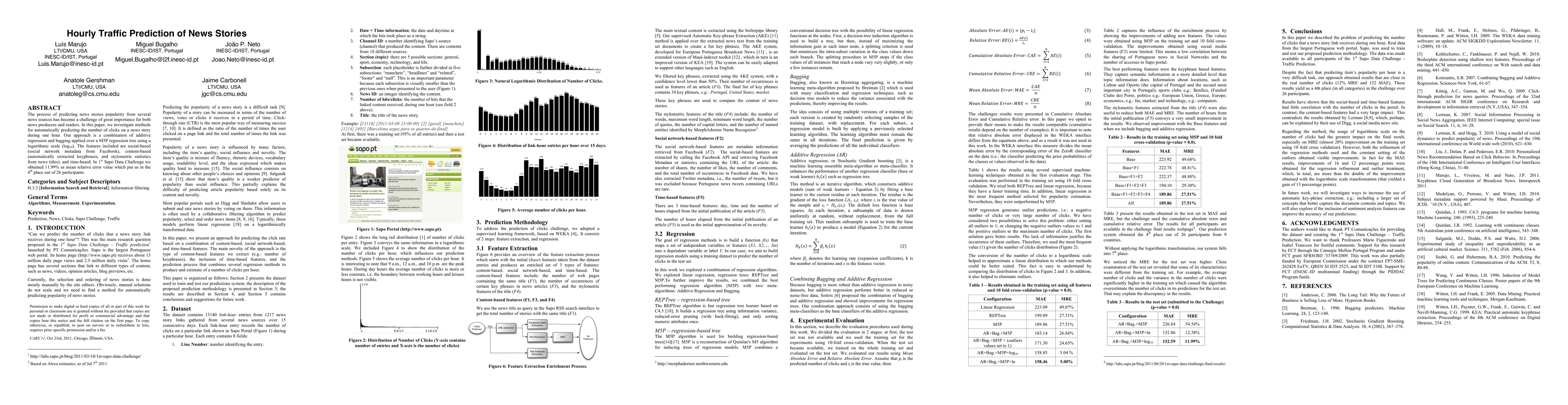 This paper proposes a method combining additive regression, bagging, and M5P regression trees to predict hourly news story clicks. The model uses social, content, and time-based features, achieving a mean relative error of 11.99% in the 1st Sapo Data Challenge, ranking 4th among 26 participants.