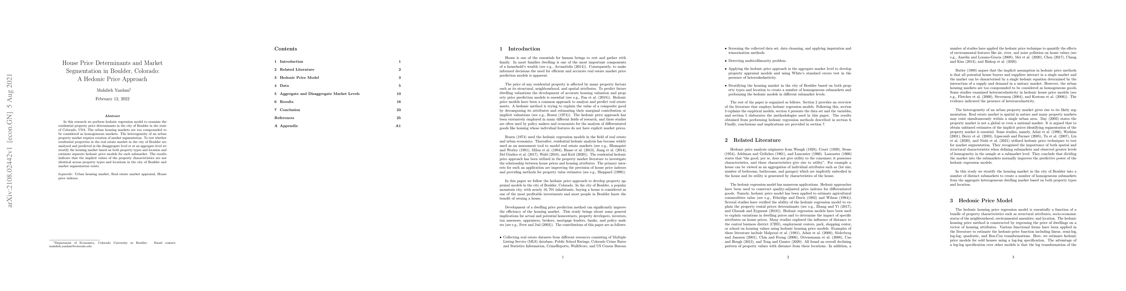 This study uses a hedonic regression model to analyze determinants of residential property prices in Boulder, Colorado, revealing that market segmentation is necessary due to differing implicit values of property characteristics across different property types and locations. The findings suggest that Boulder's housing market cannot be considered homogeneous and requires disaggregate analysis.