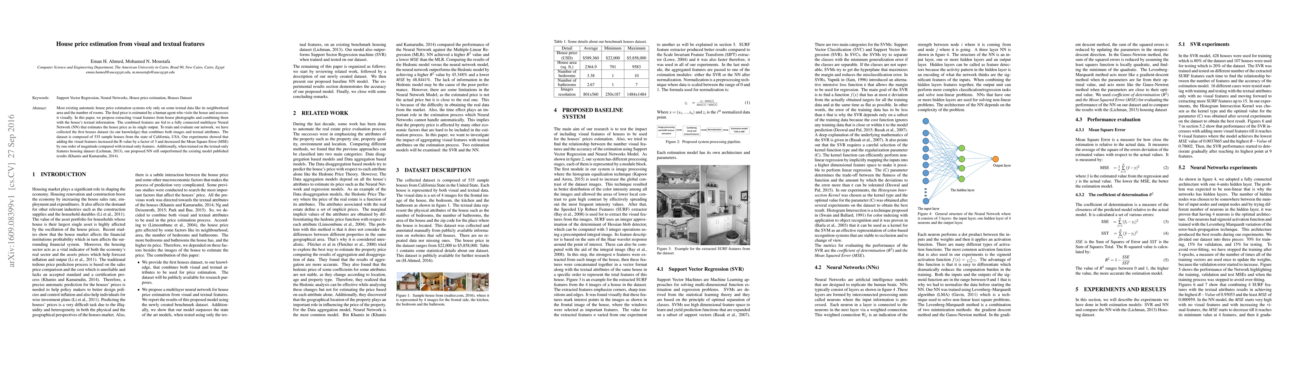 This paper proposes a method for house price estimation by combining visual features from photographs with textual data, using a multilayer Neural Network to improve accuracy. The approach significantly outperforms traditional textual-only methods, as evidenced by a threefold increase in the R-value and a tenfold reduction in Mean Square Error.