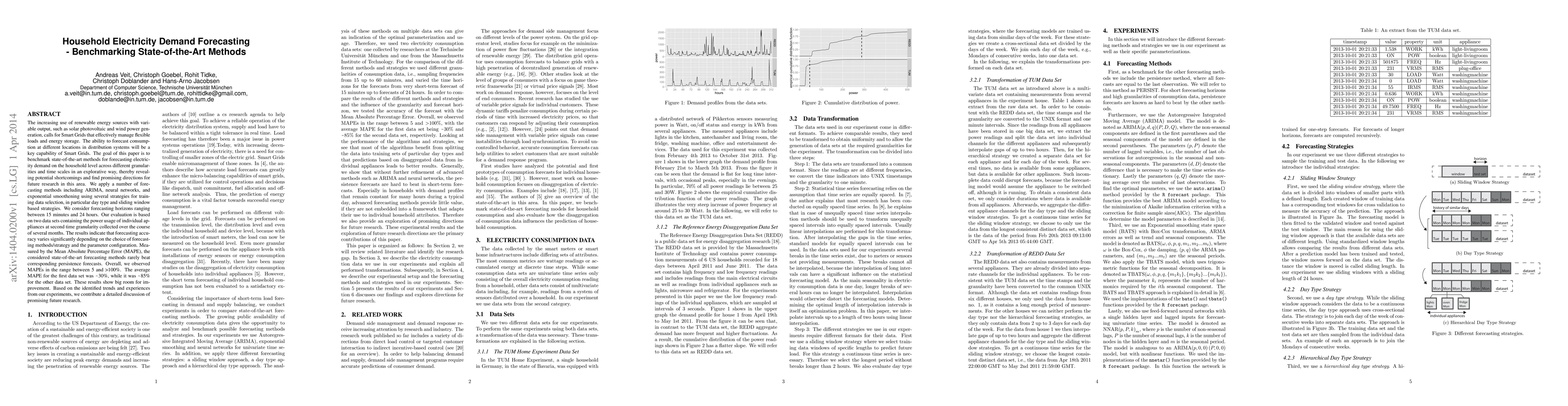 The increasing use of renewable energy sources with variable output, such as solar photovoltaic and wind power generation, calls for Smart Grids that effectively manage flexible loads and energy storage. The ability to forecast consumption at different locations in distribution systems will be a key capability of Smart Grids. The goal of this paper is to benchmark state-of-the-art methods for forecasting electricity demand on the household level across different granularities and time scales in an explorative way, thereby revealing potential shortcomings and find promising directions for future research in this area. We apply a number of forecasting methods including ARIMA, neural networks, and exponential smoothening using several strategies for training data selection, in particular day type and sliding window based strategies. We consider forecasting horizons ranging between 15 minutes and 24 hours. Our evaluation is based on two data sets containing the power usage of individual appliances at second time granularity collected over the course of several months. The results indicate that forecasting accuracy varies significantly depending on the choice of forecasting methods/strategy and the parameter configuration. Measured by the Mean Absolute Percentage Error (MAPE), the considered state-of-the-art forecasting methods rarely beat corresponding persistence forecasts. Overall, we observed MAPEs in the range between 5 and >100%. The average MAPE for the first data set was ~30%, while it was ~85% for the other data set. These results show big room for improvement. Based on the identified trends and experiences from our experiments, we contribute a detailed discussion of promising future research.