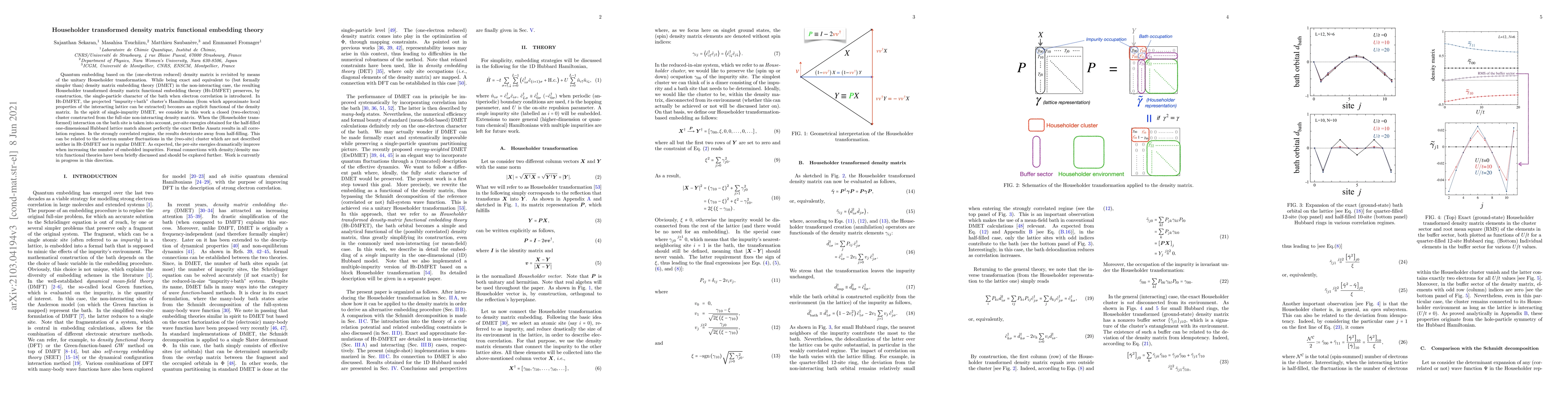 Quantum embedding based on the (one-electron reduced) density matrix is revisited by means of the unitary Householder transformation. While being exact and equivalent to (but formally simpler than) density matrix embedding theory (DMET) in the non-interacting case, the resulting Householder transformed density matrix functional embedding theory (Ht-DMFET) preserves, by construction, the single-particle character of the bath when electron correlation is introduced. In Ht-DMFET, the projected "impurity+bath" cluster's Hamiltonian (from which approximate local properties of the interacting lattice can be extracted) becomes an explicit functional of the density matrix. In the spirit of single-impurity DMET, we consider in this work a closed (two-electron) cluster constructed from the full-size non-interacting density matrix. When the (Householder transformed) interaction on the bath site is taken into account, per-site energies obtained for the half-filled one-dimensional Hubbard lattice match almost perfectly the exact Bethe Ansatz results in all correlation regimes. In the strongly correlated regime, the results deteriorate away from half-filling. This can be related to the electron number fluctuations in the (two-site) cluster which are not described neither in Ht-DMFET nor in regular DMET. As expected, the per-site energies dramatically improve when increasing the number of embedded impurities. Formal connections with density/density matrix functional theories have been briefly discussed and should be explored further. Work is currently in progress in this direction.