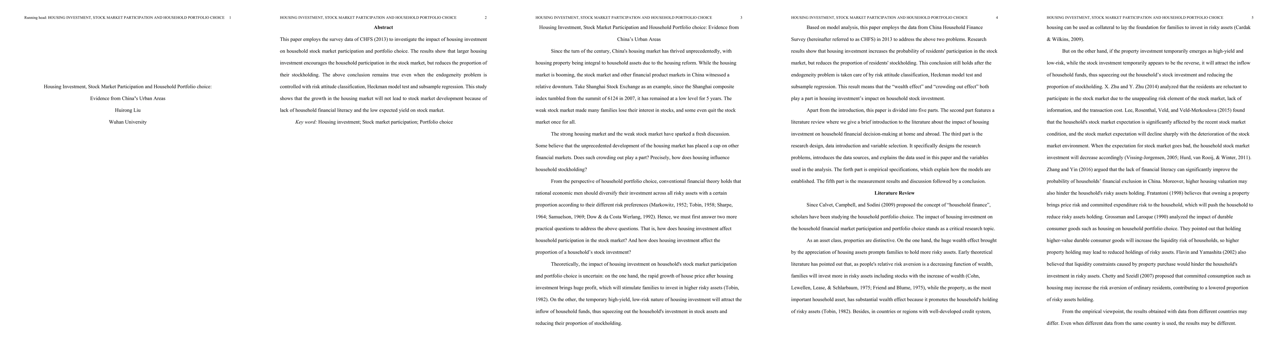 This paper employs the survey data of CHFS (2013) to investigate the impact of housing investment on household stock market participation and portfolio choice. The results show that larger housing investment encourages the household participation in the stock market, but reduces the proportion of their stockholding. The above conclusion remains true even when the endogeneity problem is controlled with risk attitude classification, Heckman model test and subsample regression. This study shows that the growth in the housing market will not lead to stock market development because of lack of household financial literacy and the low expected yield on stock market.