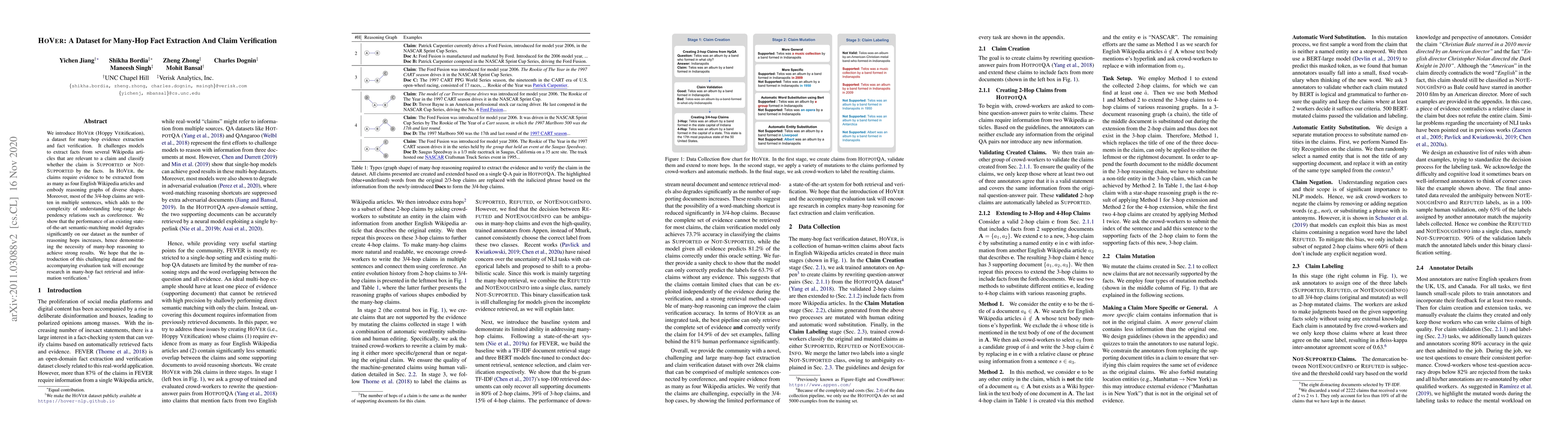 HoVer is a dataset designed to test models' abilities in many-hop evidence extraction and claim verification across multiple Wikipedia articles, requiring reasoning across diverse shapes and long-range dependencies. The dataset highlights the need for advanced many-hop reasoning techniques, as current models show significant performance drops with increased reasoning hops.