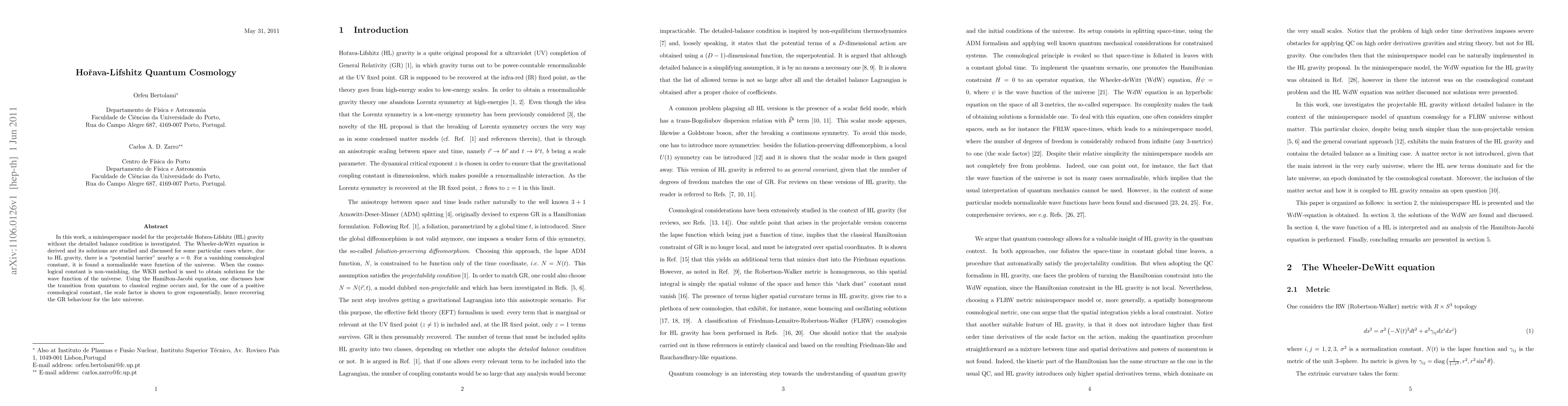 This paper investigates the minisuperspace model of projectable Hořava-Lifshitz gravity, deriving the Wheeler-deWitt equation and exploring its solutions, including a normalizable wave function for a vanishing cosmological constant and exponential growth of the scale factor for a positive cosmological constant, mirroring late-universe GR behavior.
