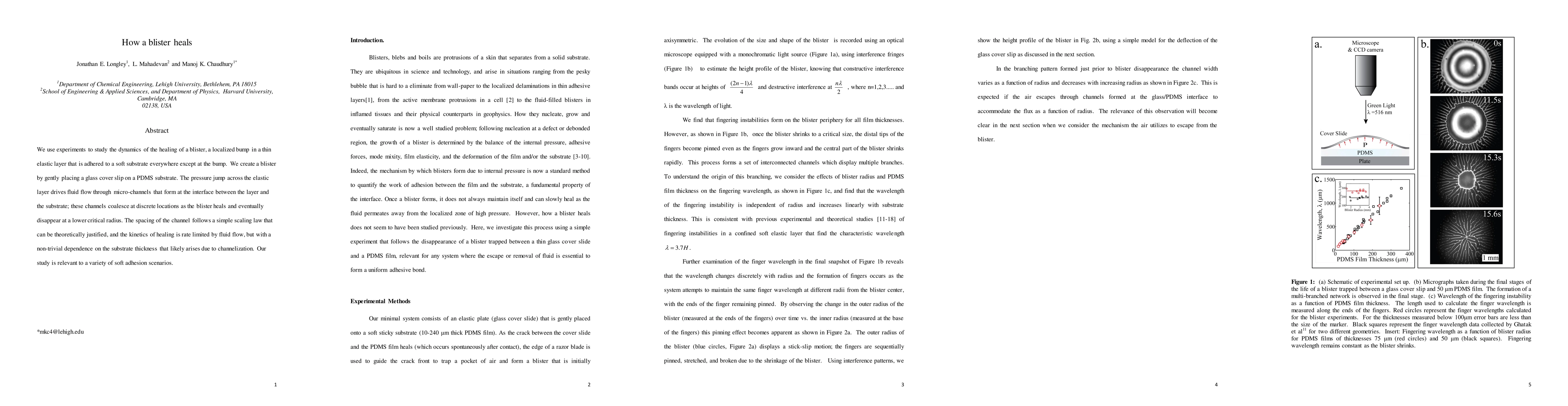 We use experiments to study the dynamics of the healing of a blister, a localized bump in a thin elastic layer that is adhered to a soft substrate everywhere except at the bump. We create a blister by gently placing a glass cover slip on a PDMS substrate. The pressure jump across the elastic layer drives fluid flow through micro-channels that form at the interface between the layer and the substrate; these channels coalesce at discrete locations as the blister heals and eventually disappear at a lower critical radius. The spacing of the channel follows a simple scaling law that can be theoretically justified, and the kinetics of healing is rate limited by fluid flow, but with a non-trivial dependence on the substrate thickness that likely arises due to channelization. Our study is relevant to a variety of soft adhesion scenarios.