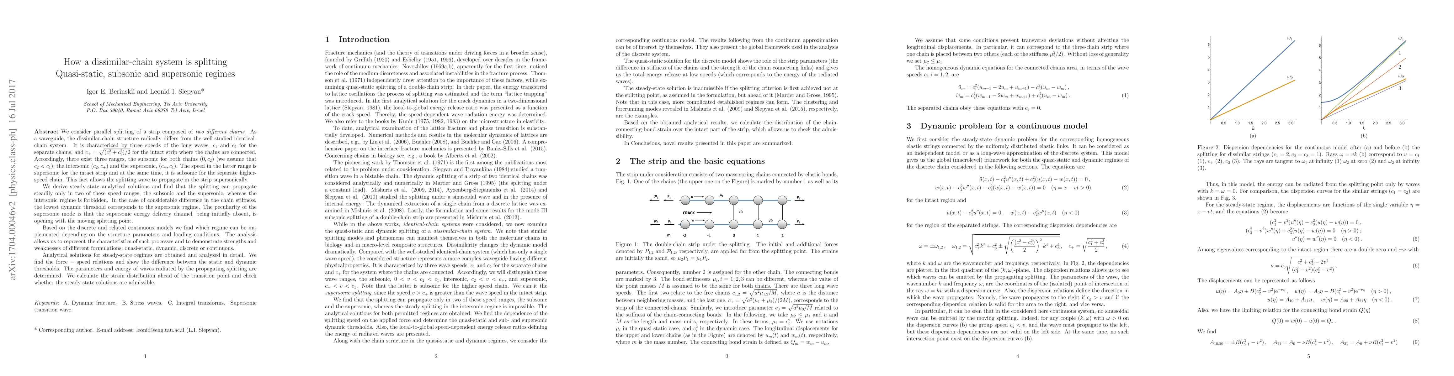 We consider parallel splitting of a strip composed of two different chains. As a waveguide, the dissimilar-chain structure radically differs from the well-studied identical-chain system. It is characterized by three speeds of the long waves, two for the separate chains, and one for the intact strip where the chains are connected. Accordingly, there exist three ranges, the subsonic for both chains, the intersonic and the supersonic. The speed in the latter range is supersonic for the intact strip and at the same time, it is subsonic for the separate higher-speed chain. This fact allows the splitting wave to propagate in the strip supersonically. We derive steady-state analytical solutions and find that the splitting can propagate steadily only in two of these speed ranges, the subsonic and the supersonic, whereas the intersonic regime is forbidden. In the case of considerable difference in the chain stiffness, the lowest dynamic threshold corresponds to the supersonic regime. The peculiarity of the supersonic mode is that the supersonic energy delivery channel, being initially absent, is opening with the moving splitting point. Based on the discrete and related continuous models we find which regime can be implemented depending on the structure parameters and loading conditions. The analysis allows us to represent the characteristics of such processes and to demonstrate strengths and weaknesses of different formulations, quasi-static, dynamic, discrete or continuous. Analytical solutions for steady-state regimes are obtained and analyzed in detail. We find the force-speed relations and show the difference between the static and dynamic thresholds. The parameters and energy of waves radiated by the propagating splitting are determined. We calculate the strain distribution ahead of the transition point and check whether the steady-state solutions are admissible.