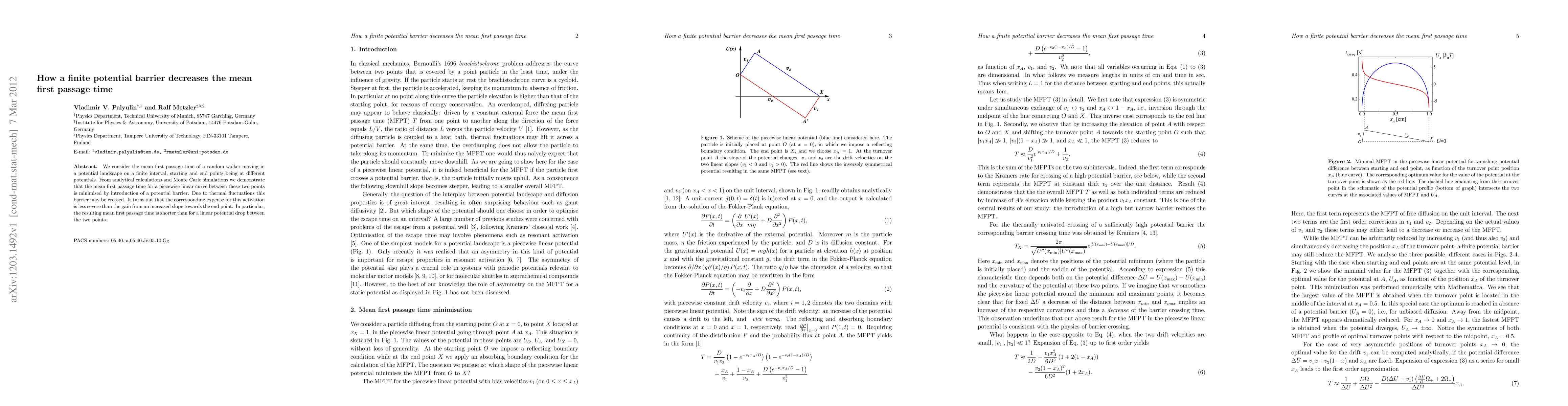 This paper demonstrates that introducing a finite potential barrier in a piecewise linear potential landscape can minimize the mean first passage time for a random walker, showing that the benefit from an increased slope towards the end point outweighs the cost of crossing the barrier due to thermal fluctuations.