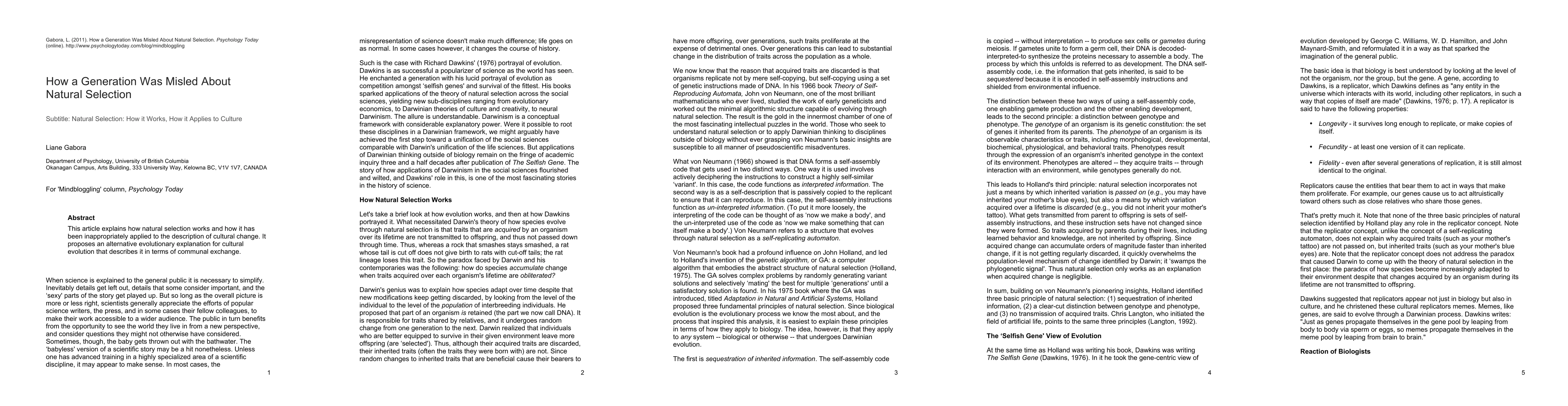 This article explains how natural selection works and how it has been inappropriately applied to the description of cultural change. It proposes an alternative evolutionary explanation for cultural evolution that describes it in terms of communal exchange.
