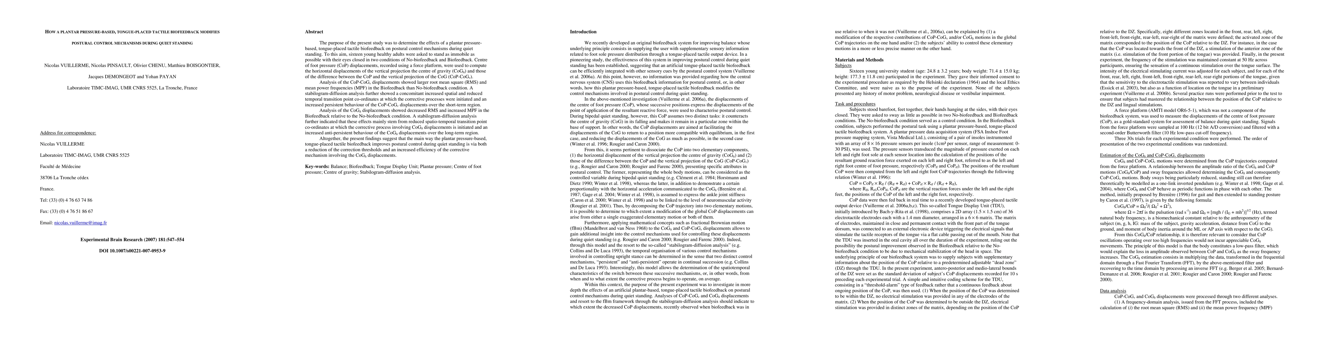 This study investigates how plantar pressure-based, tongue-placed tactile biofeedback influences postural control during quiet standing. Results show that biofeedback reduces correction thresholds and enhances the efficiency of corrective mechanisms involving horizontal center of gravity displacements.