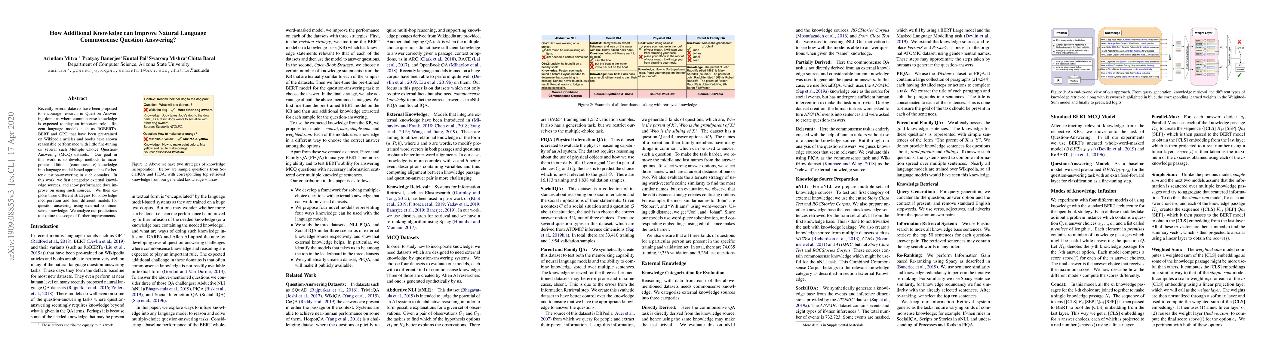 This research investigates methods to enhance natural language question answering by integrating external commonsense knowledge. It categorizes knowledge sources and demonstrates performance improvements using various incorporation strategies and models, aiming to improve question-answering accuracy on multiple-choice datasets.