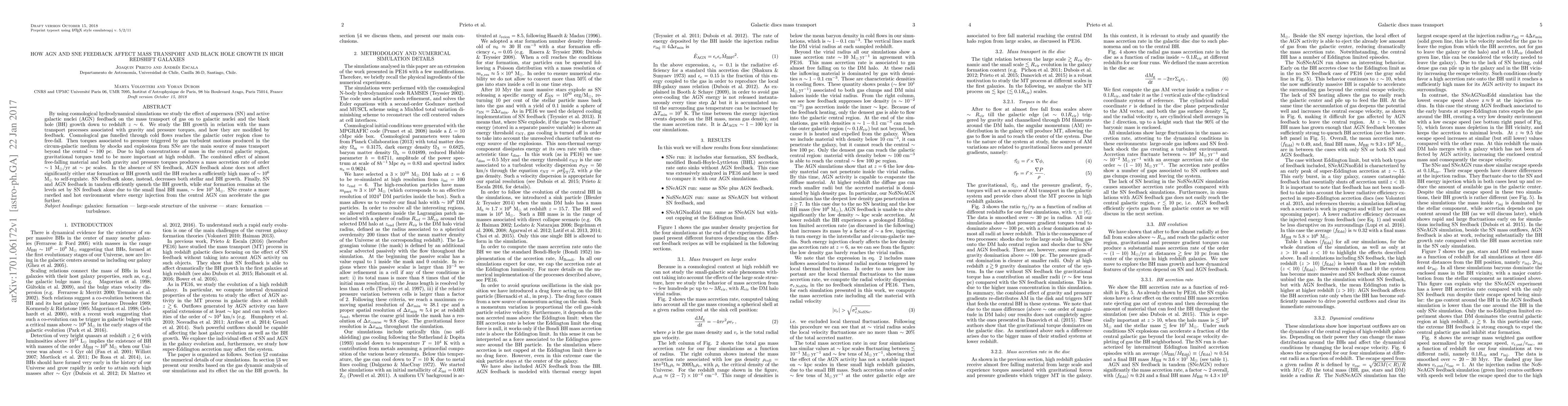 This study uses cosmological simulations to explore the impact of supernova (SN) and active galactic nuclei (AGN) feedback on gas mass transport and black hole (BH) growth in high-redshift galaxies. It finds that SN feedback alone reduces both stellar and BH growth, while AGN feedback alone only significantly impacts BH growth when it reaches a mass of ~10^6 M_sun. Combined SN and AGN feedback efficiently quenches BH growth, maintaining star formation levels set by SN feedback alone.