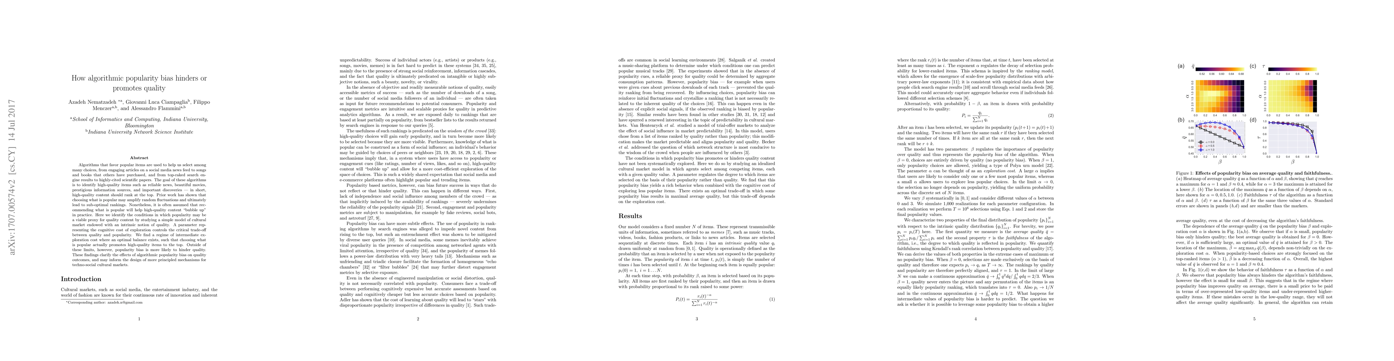This paper examines how algorithmic popularity bias affects the promotion of high-quality content. It finds that under certain conditions, such as an intermediate cognitive cost of exploration, popularity can effectively highlight quality items, but outside these conditions, it tends to hinder quality.
