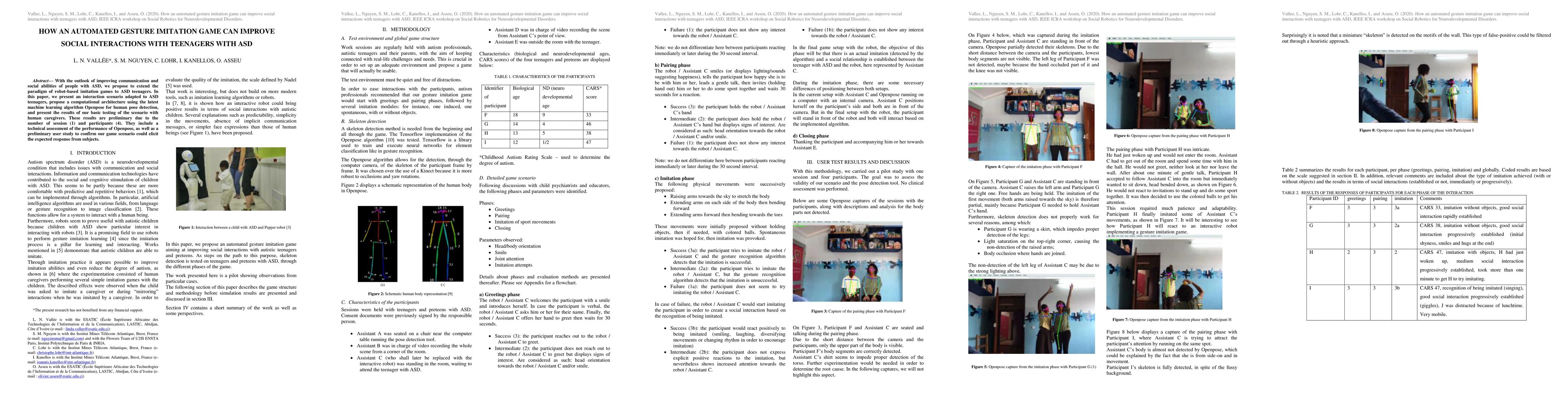 The study proposes an automated gesture imitation game using Openpose for human pose detection to enhance social interactions for teenagers with ASD. Initial testing with human caregivers suggests the game scenario may effectively engage participants, though results are preliminary due to limited sessions and participants.