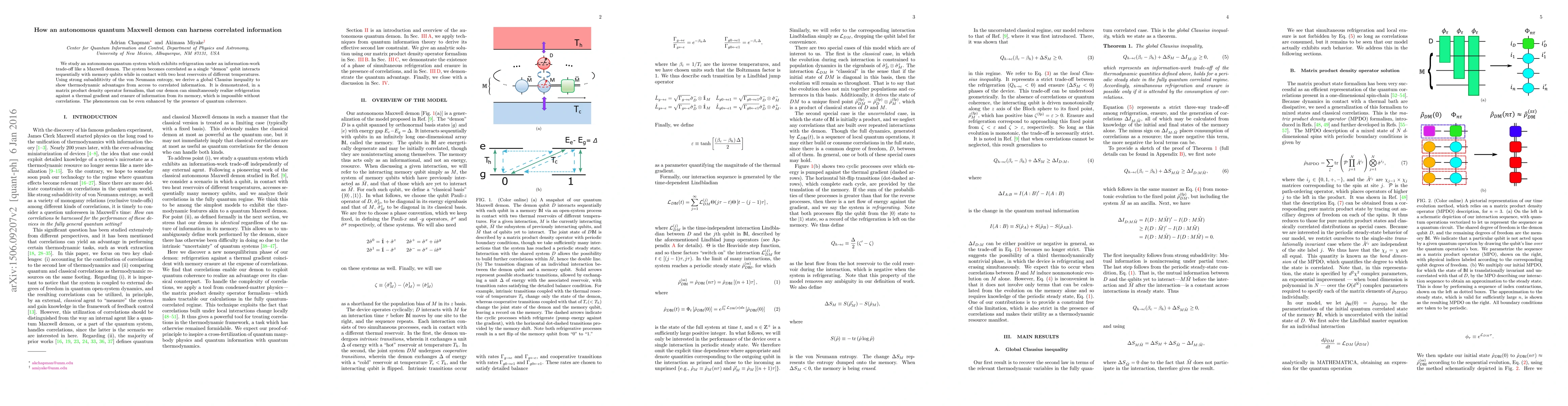 We study an autonomous quantum system which exhibits refrigeration under an information-work trade-off like a Maxwell demon. The system becomes correlated as a single "demon" qubit interacts sequentially with memory qubits while in contact with two heat reservoirs of different temperatures. Using strong subadditivity of the von Neumann entropy, we derive a global Clausius inequality to show thermodynamic advantages from access to correlated information. It is demonstrated, in a matrix product density operator formalism, that our demon can simultaneously realize refrigeration against a thermal gradient and erasure of information from its memory, which is impossible without correlations. The phenomenon can be even enhanced by the presence of quantum coherence.