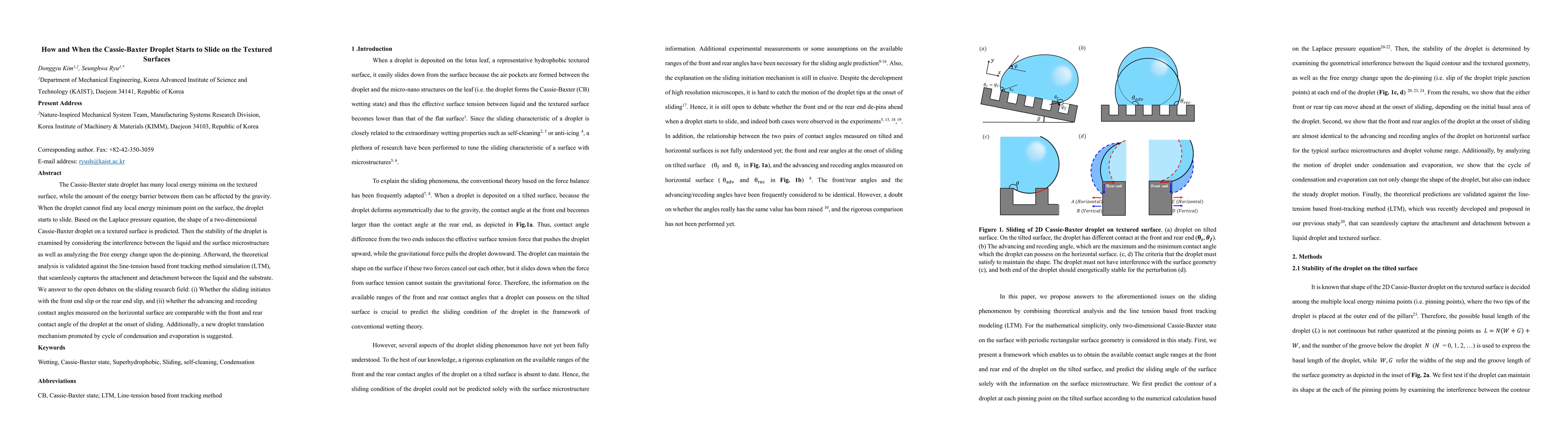 The Cassie-Baxter state droplet has many local energy minima on the textured surface, while the amount of the energy barrier between them can be affected by the gravity. When the droplet cannot find any local energy minimum point on the surface, the droplet starts to slide. Based on the Laplace pressure equation, the shape of a two-dimensional Cassie-Baxter droplet on a textured surface is predicted. Then the stability of the droplet is examined by considering the interference between the liquid and the surface microstructure as well as analyzing the free energy change upon the de-pinning. Afterward, the theoretical analysis is validated against the line-tension based front tracking method simulation (LTM), that seamlessly captures the attachment and detachment between the liquid and the substrate. We answer to the open debates on the sliding research field: (i) Whether the sliding initiates with the front end slip or the rear end slip, and (ii) whether the advancing and receding contact angles measured on the horizontal surface are comparable with the front and rear contact angle of the droplet at the onset of sliding. Additionally, a new droplet translation mechanism promoted by cycle of condensation and evaporation is suggested.