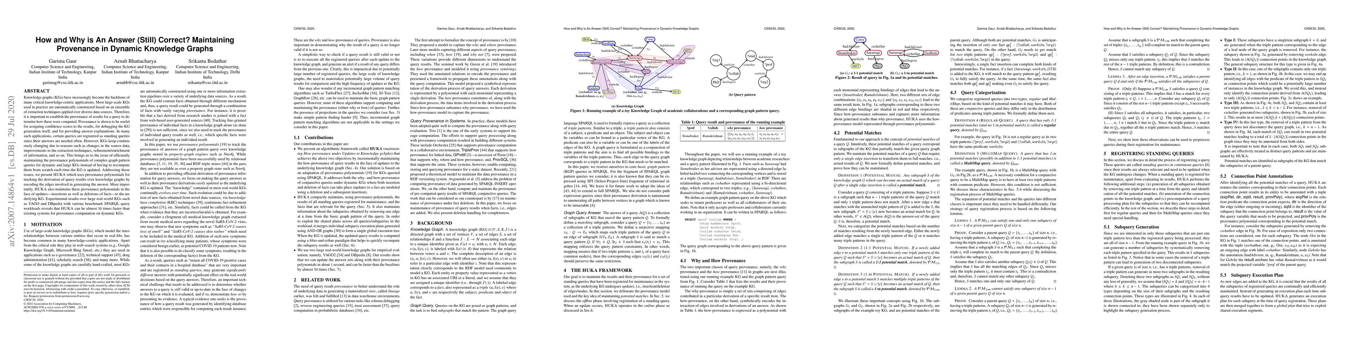 Knowledge graphs (KGs) have increasingly become the backbone of many critical knowledge-centric applications. Most large-scale KGs used in practice are automatically constructed based on an ensemble of extraction techniques applied over diverse data sources. Therefore, it is important to establish the provenance of results for a query to determine how these were computed. Provenance is shown to be useful for assigning confidence scores to the results, for debugging the KG generation itself, and for providing answer explanations. In many such applications, certain queries are registered as standing queries since their answers are needed often. However, KGs keep continuously changing due to reasons such as changes in the source data, improvements to the extraction techniques, refinement/enrichment of information, and so on. This brings us to the issue of efficiently maintaining the provenance polynomials of complex graph pattern queries for dynamic and large KGs instead of having to recompute them from scratch each time the KG is updated. Addressing these issues, we present HUKA which uses provenance polynomials for tracking the derivation of query results over knowledge graphs by encoding the edges involved in generating the answer. More importantly, HUKA also maintains these provenance polynomials in the face of updates---insertions as well as deletions of facts---to the underlying KG. Experimental results over large real-world KGs such as YAGO and DBpedia with various benchmark SPARQL query workloads reveals that HUKA can be almost 50 times faster than existing systems for provenance computation on dynamic KGs.