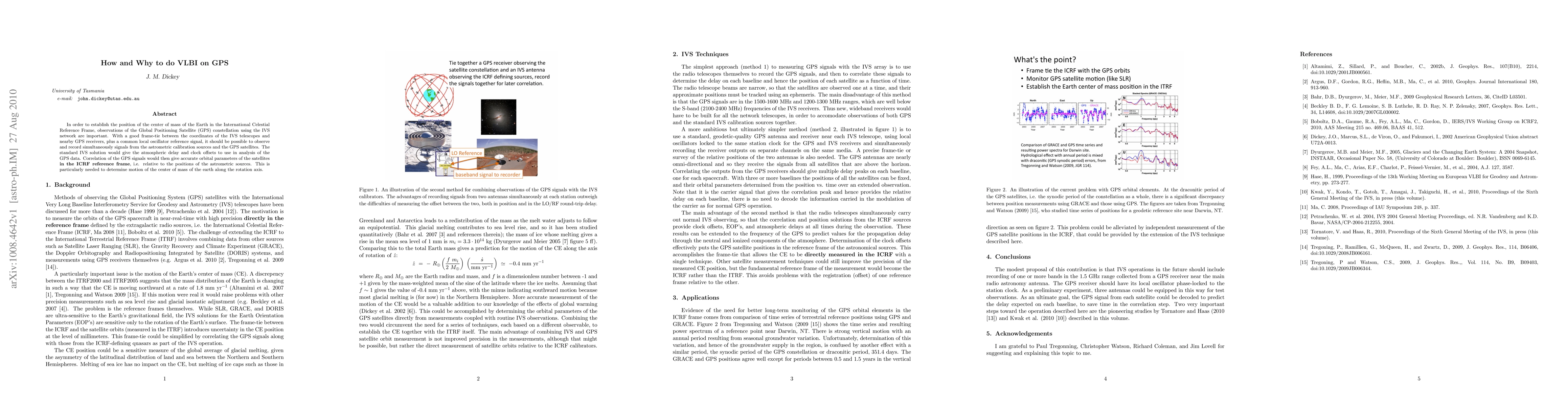 In order to establish the position of the center of mass of the Earth in the International Celestial Reference Frame, observations of the Global Positioning Satellite (GPS) constellation using the IVS network are important. With a good frame-tie between the coordinates of the IVS telescopes and nearby GPS receivers, plus a common local oscillator reference signal, it should be possible to observe and record simultaneously signals from the astrometric calibration sources and the GPS satellites. The standard IVS solution would give the atmospheric delay and clock offsets to use in analysis of the GPS data. Correlation of the GPS signals would then give accurate orbital parameters of the satellites {\bf in the ICRF reference frame}, i.e. relative to the positions of the astrometric sources. This is particularly needed to determine motion of the center of mass of the earth along the rotation axis.