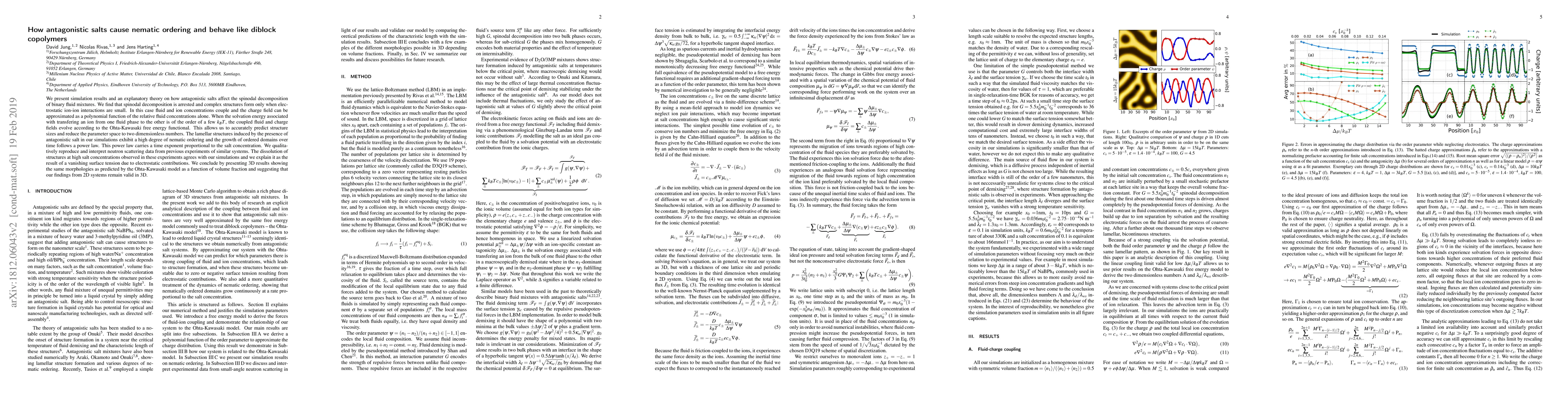 We present simulation results and an explanatory theory on how antagonistic salts affect the spinodal decomposition of binary fluid mixtures. We find that spinodal decomposition is arrested and complex structures form only when electrostatic ion-ion interactions are small. In this case fluid and ion concentrations couple and the charge field can be approximated as a polynomial function of the relative fluid concentrations alone. When the solvation energy associated with transfering an ion from one fluid phase to the other is of the order of a few k_BT, the coupled fluid and charge fields evolve according to the Ohta-Kawasaki free energy functional. This allows us to accurately predict structure sizes and reduce the parameter space to two dimensionless numbers. The lamellar structures induced by the presence of antagonistic salt in our simulations exhibit a high degree of nematic ordering and the growth of ordered domains over time seems to follow a power law. This power law carries a time exponent proportional to the salt concentration. We reproduce and interpret neutron scattering data from previous experiments of similar systems. The dissolution of structures at high salt concentrations observed in these experiments agrees with our simulations and we explain it as the result of a vanishing surface tension due to electrostatic contributions. We conclude by presenting preliminary 3D results showing the same morphologies as predicted by the Ohta-Kawasaki model as a function of volume fraction and suggesting that our findings from 2D systems remain valid in 3D.