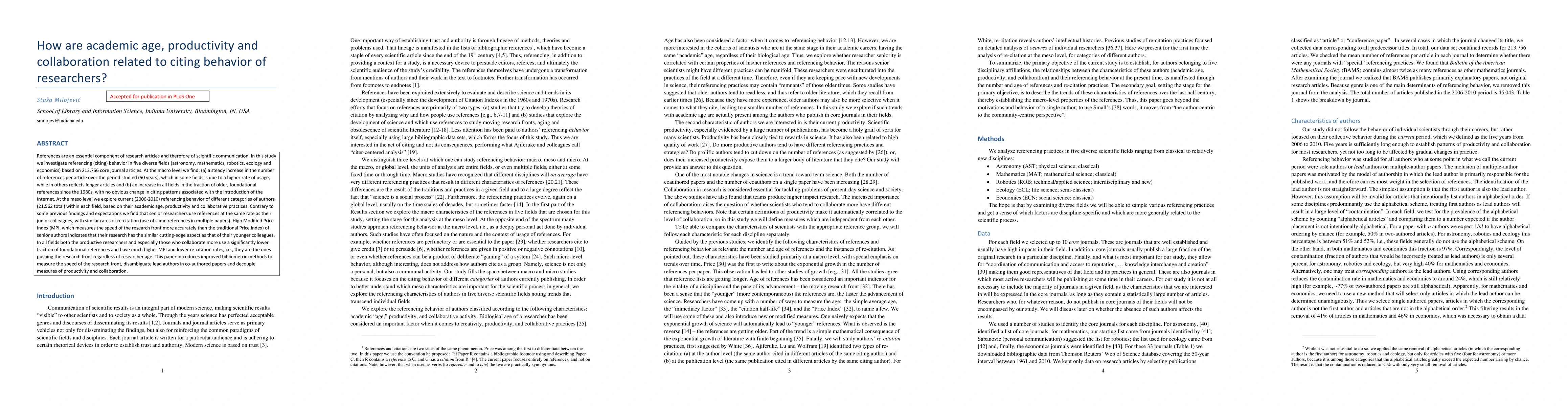 References are an essential component of research articles and therefore of scientific communication. In this study we investigate referencing (citing) behavior in five diverse fields (astronomy, mathematics, robotics, ecology and economics) based on 213,756 core journal articles. At the macro level we find: (a) a steady increase in the number of references per article over the period studied (50 years), which in some fields is due to a higher rate of usage, while in others reflects longer articles and (b) an increase in all fields in the fraction of older, foundational references since the 1980s, with no obvious change in citing patterns associated with the introduction of the Internet. At the meso level we explore current (2006-2010) referencing behavior of different categories of authors (21,562 total) within each field, based on their academic age, productivity and collaborative practices. Contrary to some previous findings and expectations we find that senior researchers use references at the same rate as their junior colleagues, with similar rates of re-citation (use of same references in multiple papers). High Modified Price Index (MPI, which measures the speed of the research front more accurately than the traditional Price Index) of senior authors indicates that their research has the similar cutting-edge aspect as that of their younger colleagues. In all fields both the productive researchers and especially those who collaborate more use a significantly lower fraction of foundational references and have much higher MPI and lower re-citation rates, i.e., they are the ones pushing the research front regardless of researcher age. This paper introduces improved bibliometric methods to measure the speed of the research front, disambiguate lead authors in co-authored papers and decouple measures of productivity and collaboration.